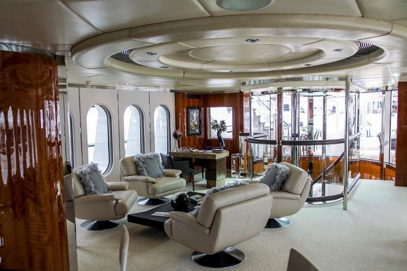 All Star 1 offers an estimated cruising range of around 3,750 nautical miles and is arranged for both extended cruising and entertaining large groups. Entry on the main deck leads to a triple-height atrium featuring a floating stainless-steel and glass spiral staircase.