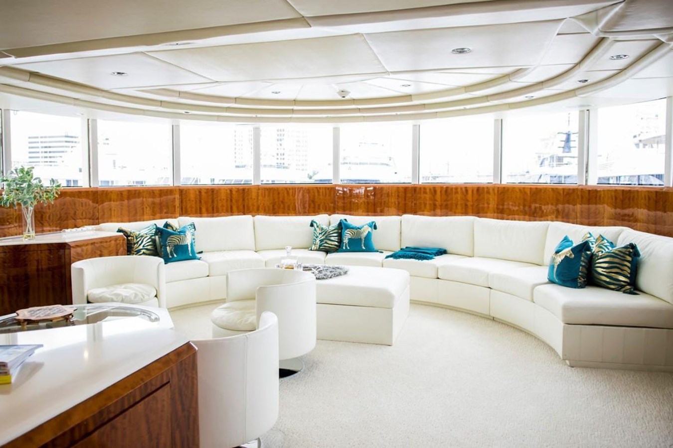 On the upper deck, All Star 1 features a salon with a full service bar, seating areas with floor-to-ceiling windows and a forward observation lounge arranged around a circular sofa. Exterior spaces include an aft upper deck dining area for up to twenty guests and a hydraulic transom door forming a beach club with diving board.