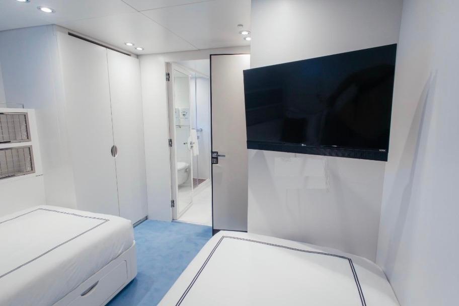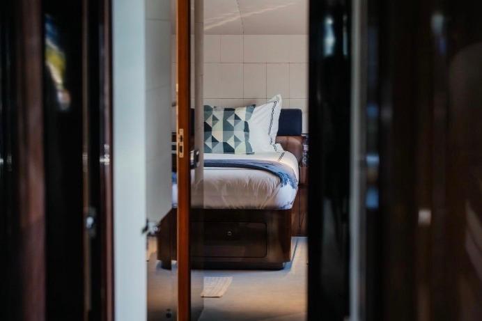The interior accommodates up to 10 guests in 5 well-proportioned cabins: a full-beam Owner’s suite, two double cabins, and two twin cabins. Crew quarters allow for up to 7 members, ensuring discreet and professional service at all times.