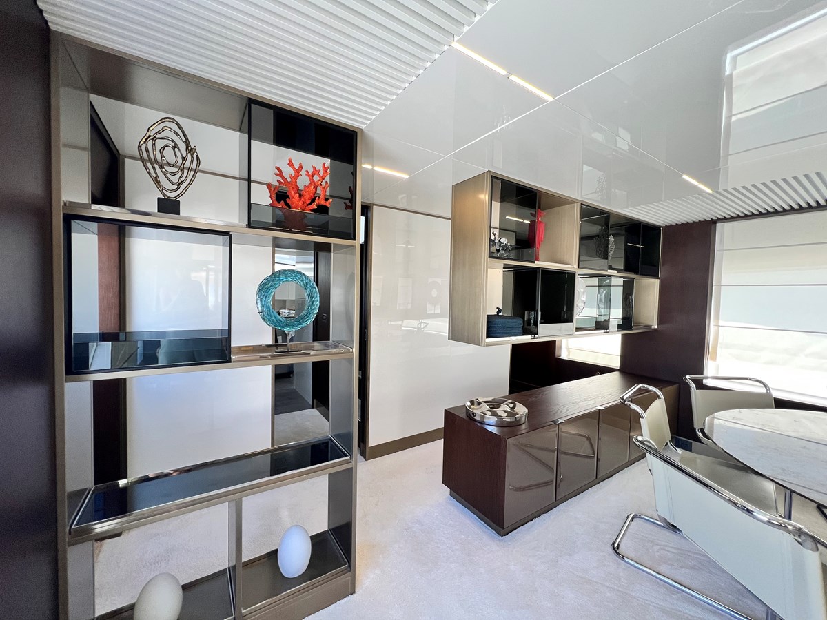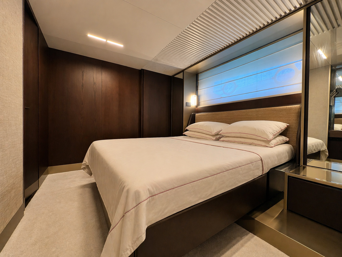 The lower deck accommodates 8 guests in 4 en-suite cabins, all finished to Ferretti’s high standards: