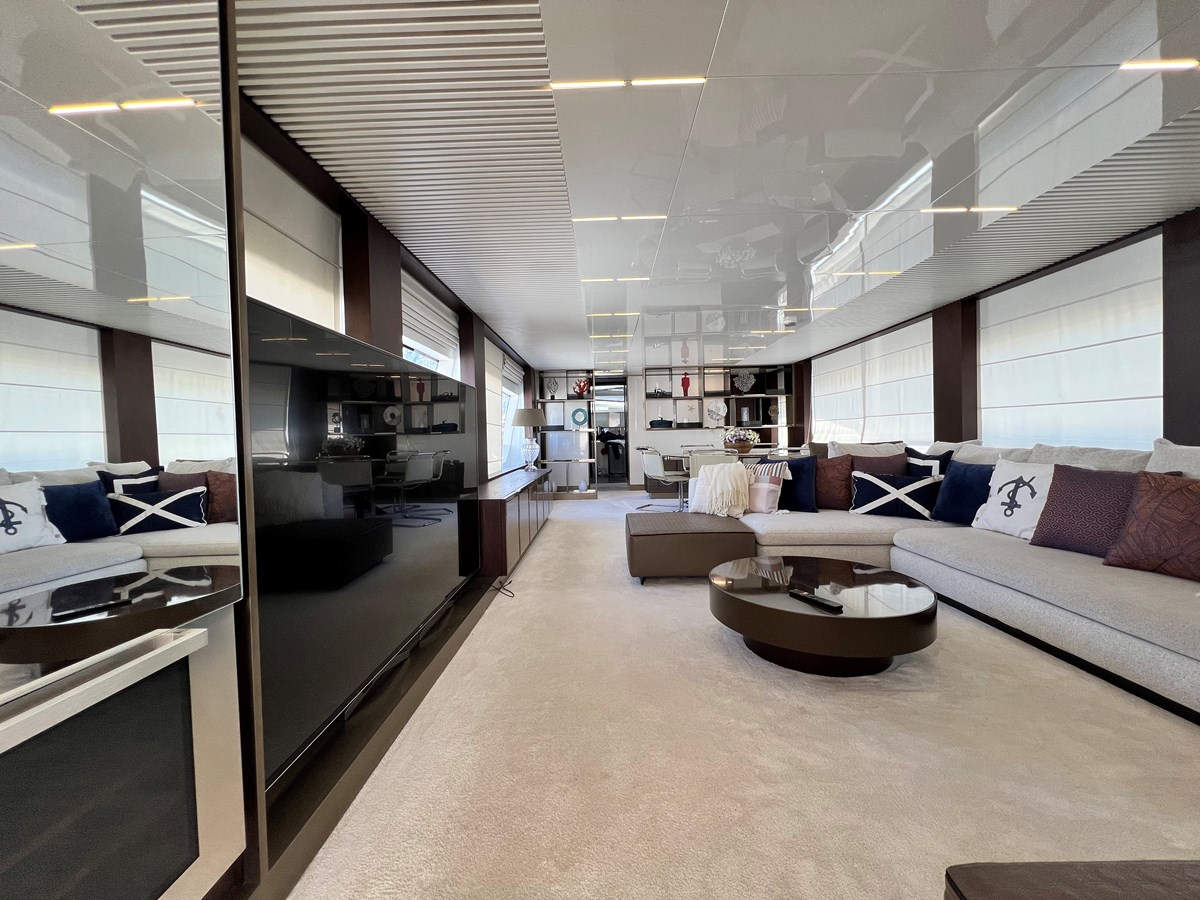 The expansive flybridge offers an upper helm station, large seating and dining areas, sunbathing spaces, and a fully equipped wet bar, making it an ideal area for relaxation and entertainment. Aft, the opening transom creates a generous beach club and swim platform, providing easy access to the sea and water toys.