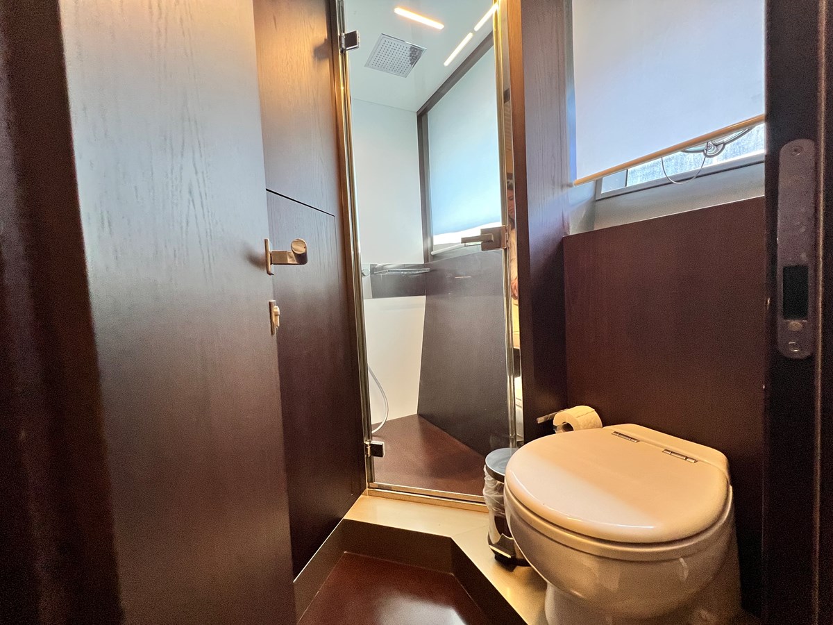 Separate crew quarters are located aft, accessed independently from the cockpit, and comprise two crew cabins accommodating 3–4 crew, a crew bathroom, and direct access to the engine room—allowing professional operation without disturbing guests.