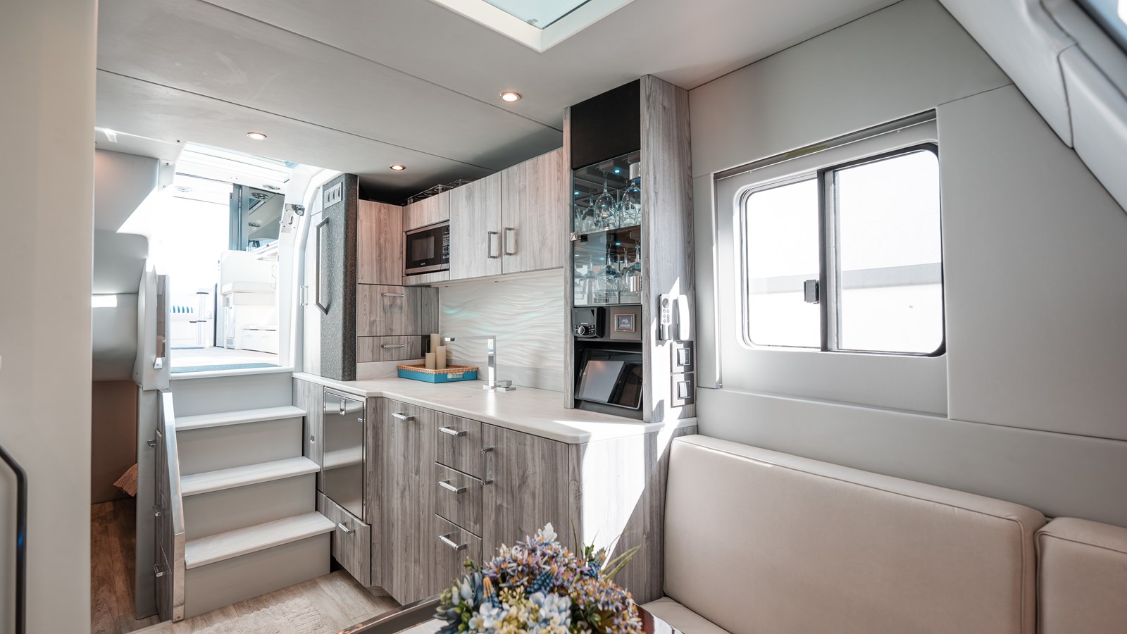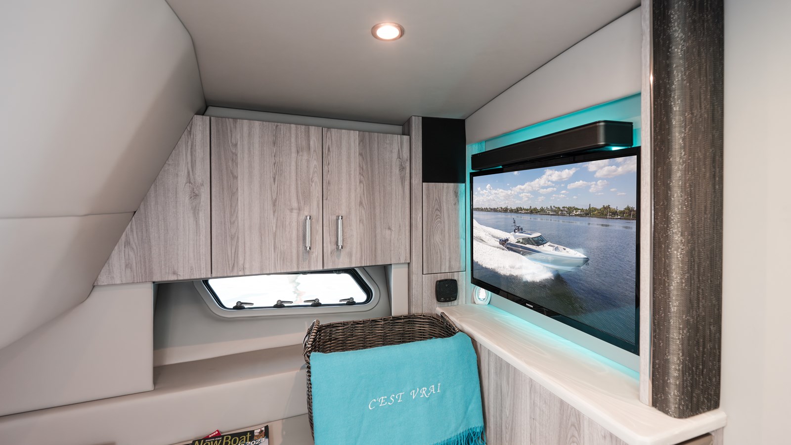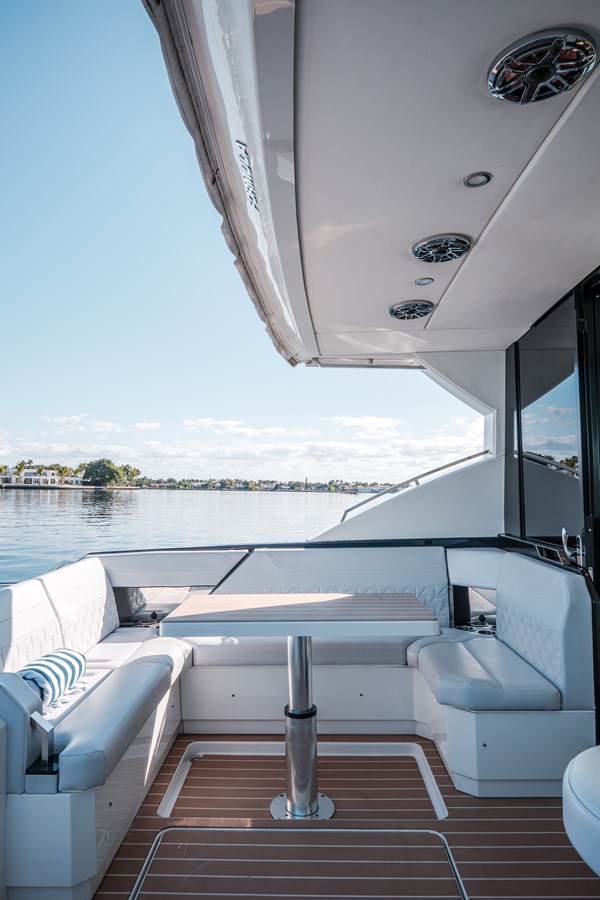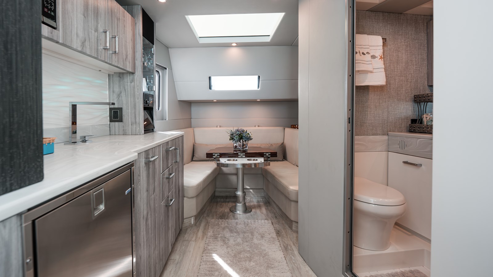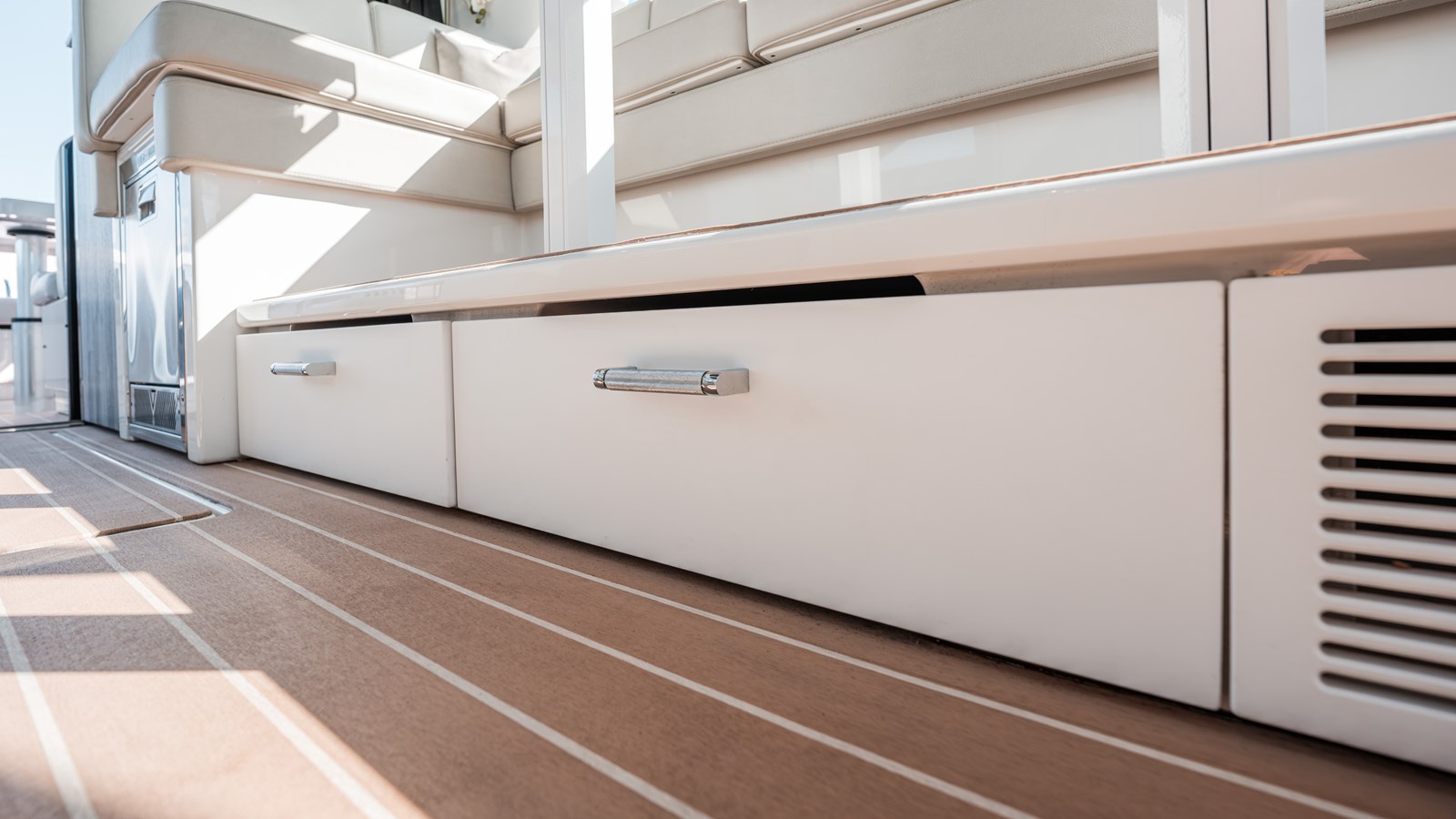 The 500 SSC amenities below offer a respite from the outside world with a true cabin experience. A complete galley at the cabin entry stairs, the large convertible U-lounge forward, a head with Corian surfacing, vanity sink and spacious shower create a residential feel. Slip aft to the separate stateroom with queen-size berth, sofa and complete entertainment suite.