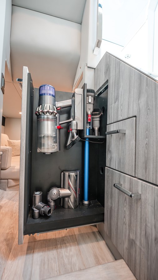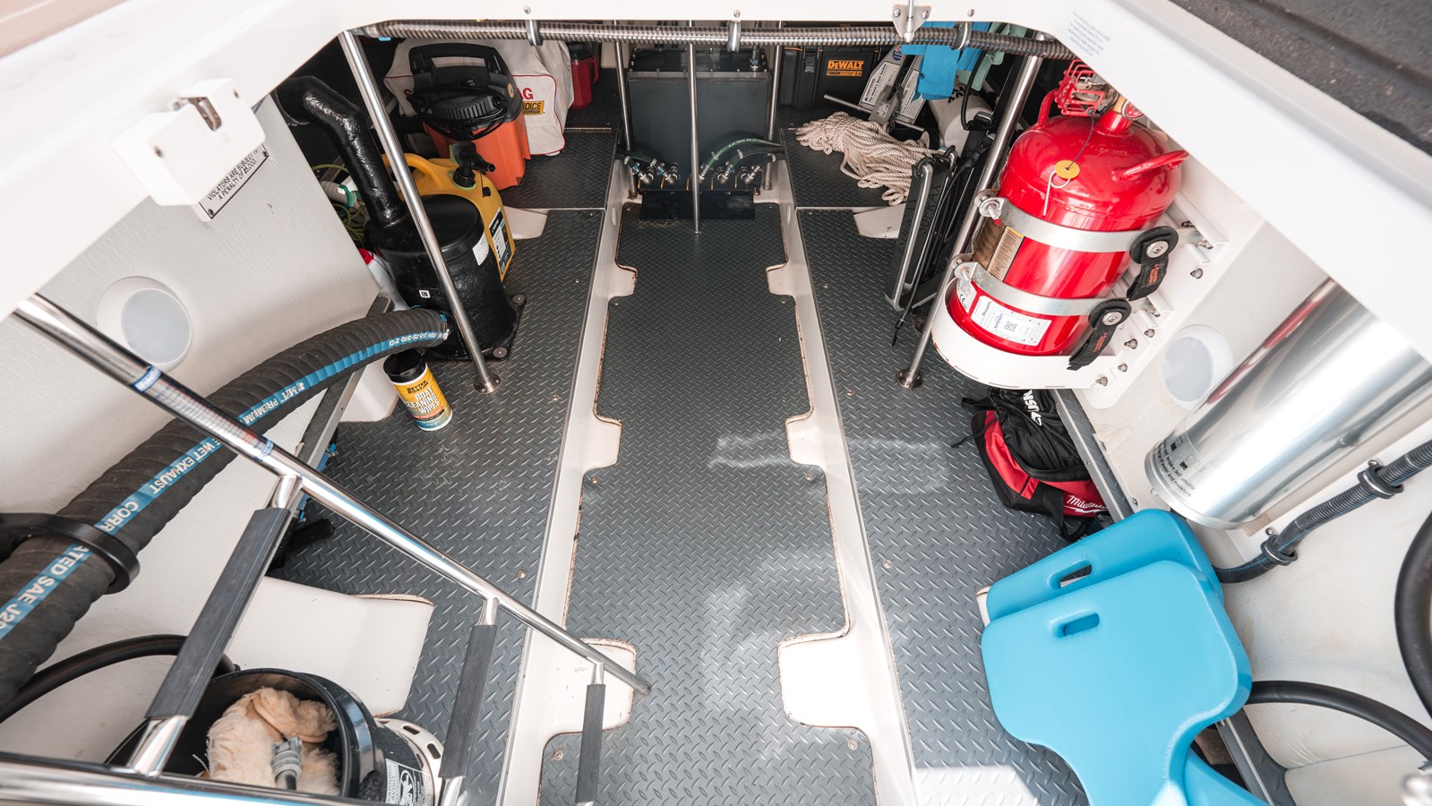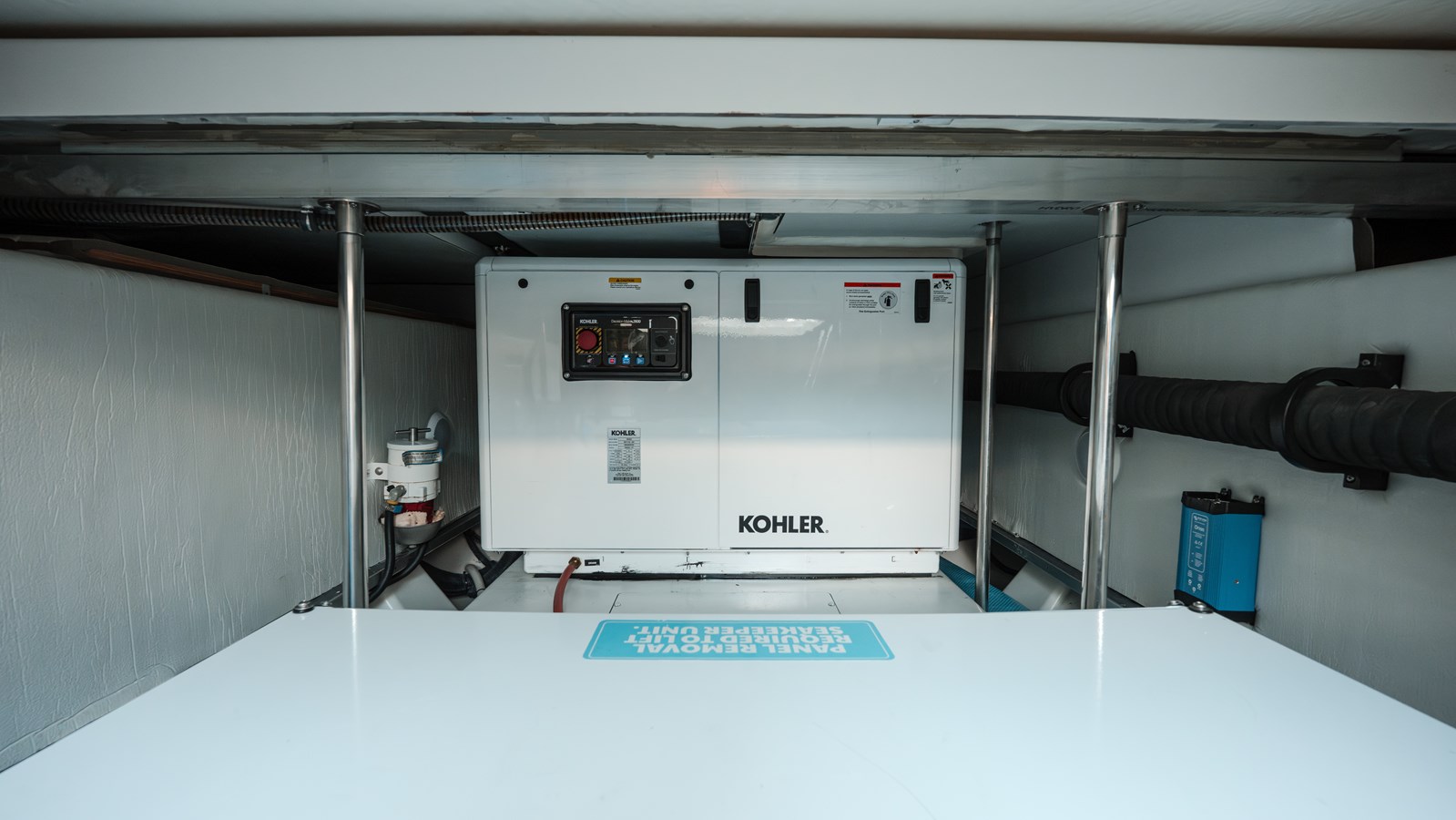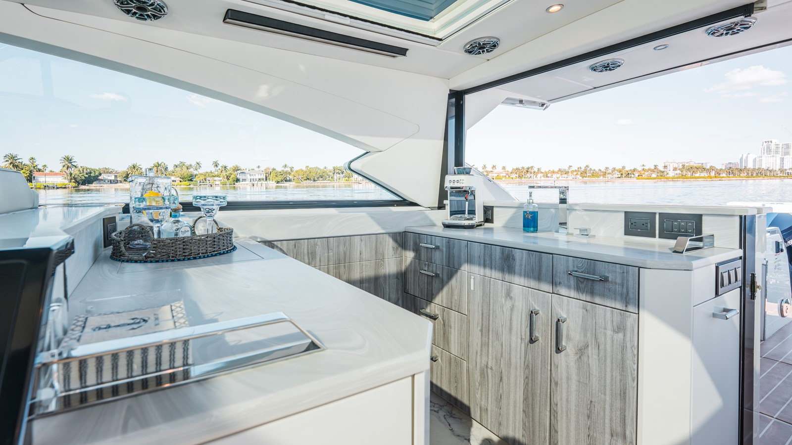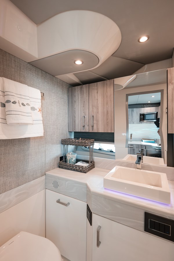 The 500 SSC amenities below offer a respite from the outside world with a true cabin experience. A complete galley at the cabin entry stairs, the large convertible U-lounge forward, a head with Corian surfacing, vanity sink and spacious shower create a residential feel. Slip aft to the separate stateroom with queen-size berth, sofa and complete entertainment suite.