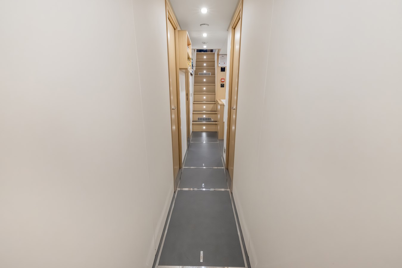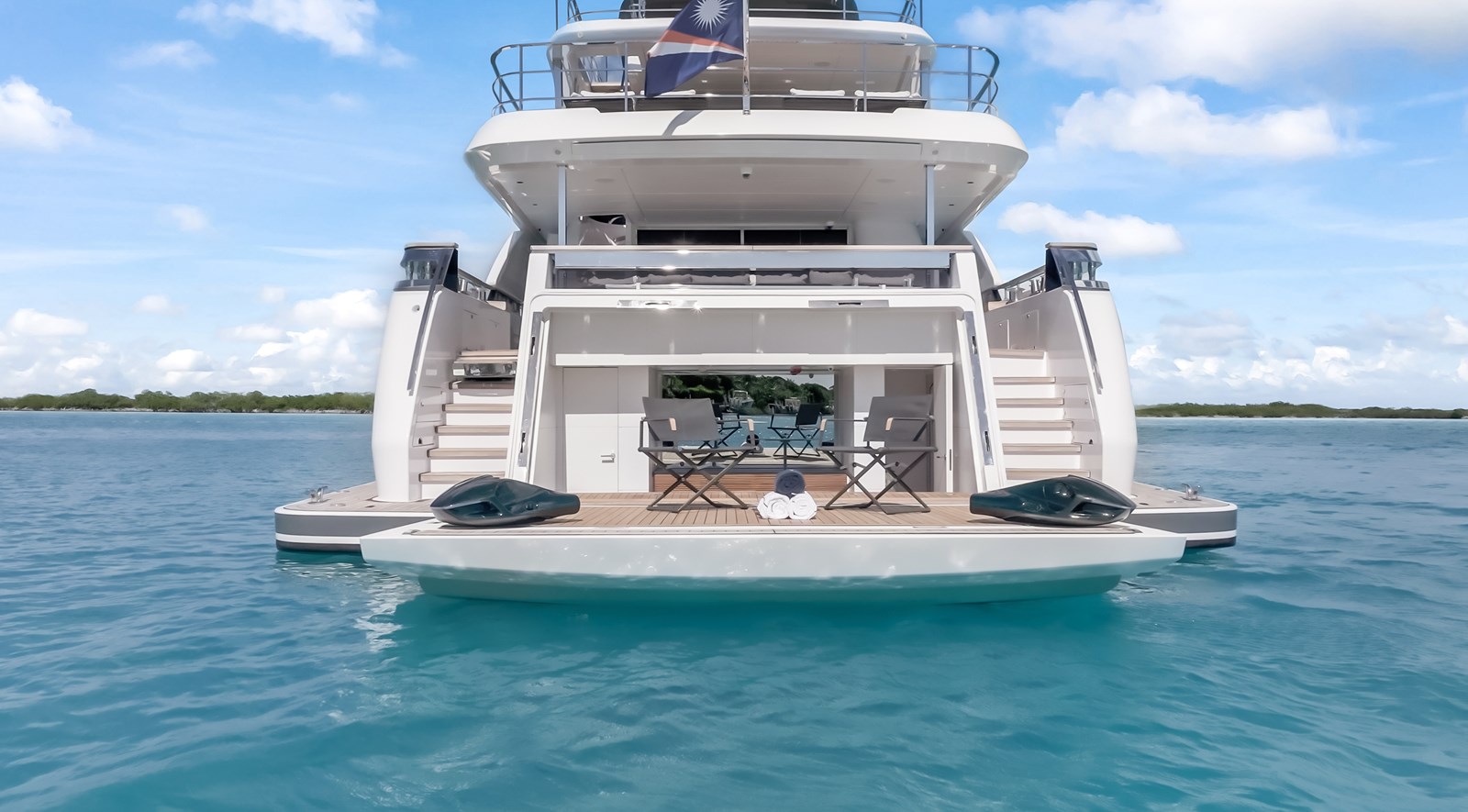 Inside and out, her custom configuration was designed for elite, uncompromising comfort for up to 10 guests. Standout features include a spectacular drop-down electric balcony off the main deck , a sprawling sun deck complete with an extended Jacuzzi pool and Teppanyaki grill , and an incredible Invisible Black marble upgrade sweeping through the luxurious en-suites. At the water's edge, the transom folds down to reveal a massive, teak-laid beach club perfectly outfitted for entertaining with a custom bar, icemaker, and an additional freezer. Equipped with a high-capacity Atlas shore power converter for seamless global cruising, she is a turnkey masterpiece ready for her next owner.