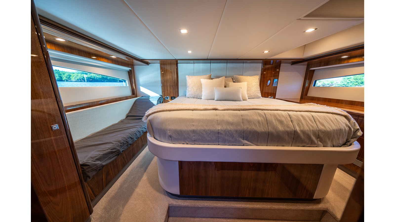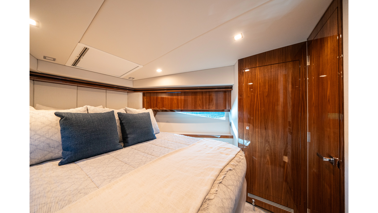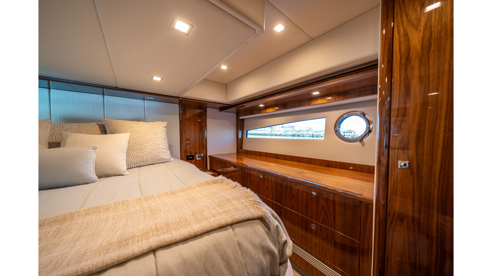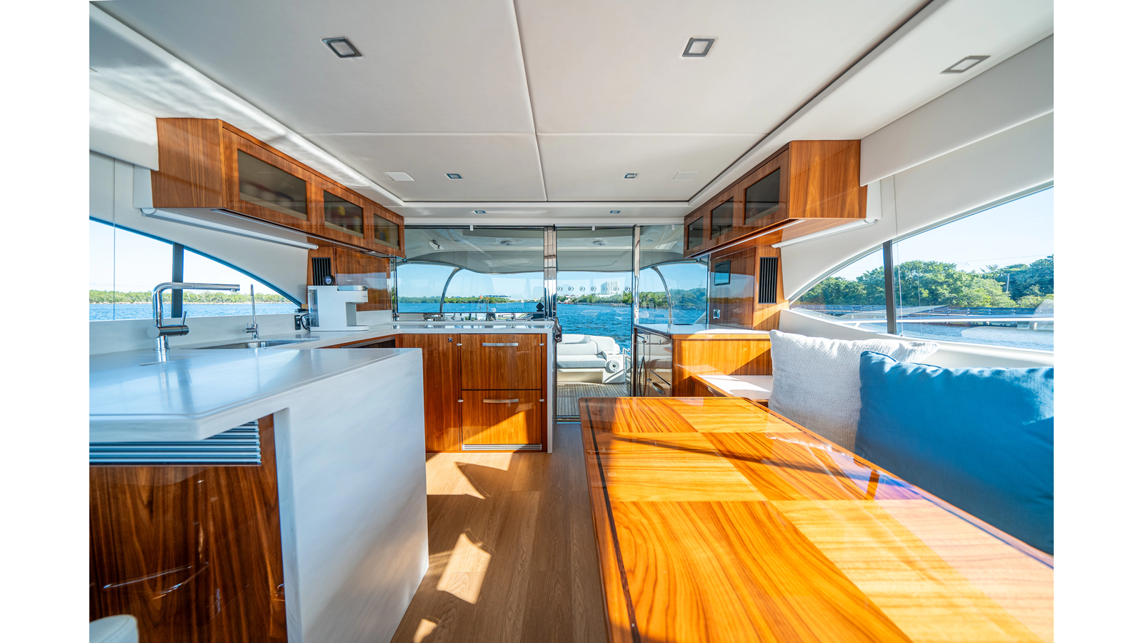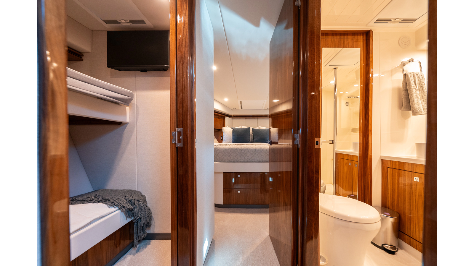 - Three-stateroom layout with high-gloss timber finishes
