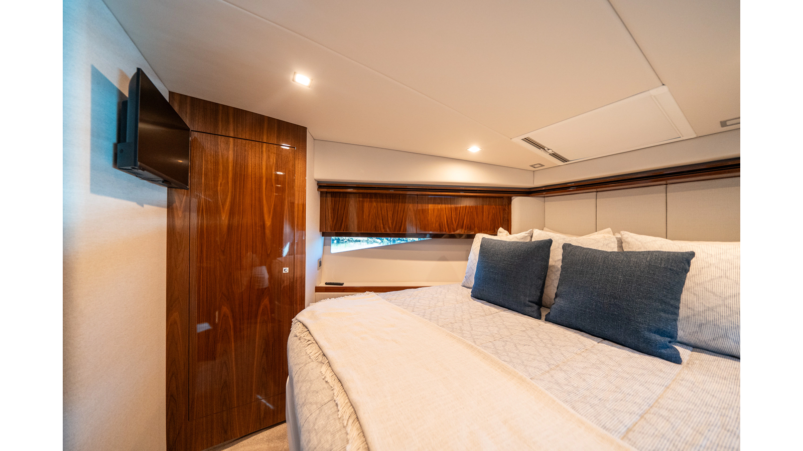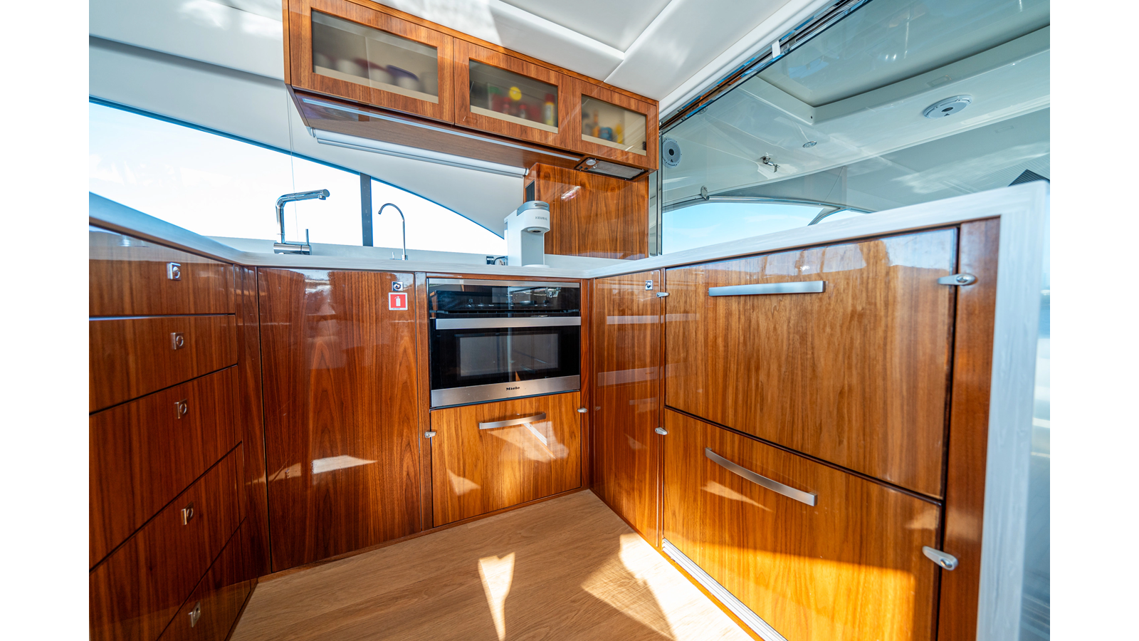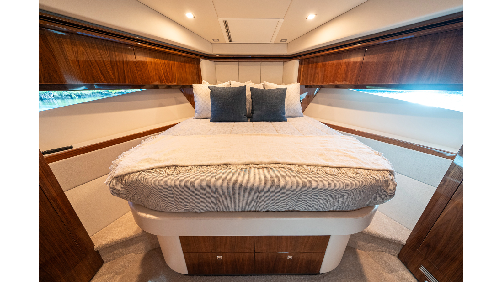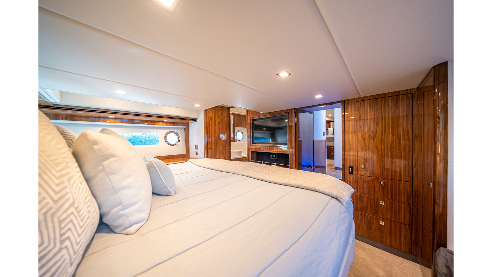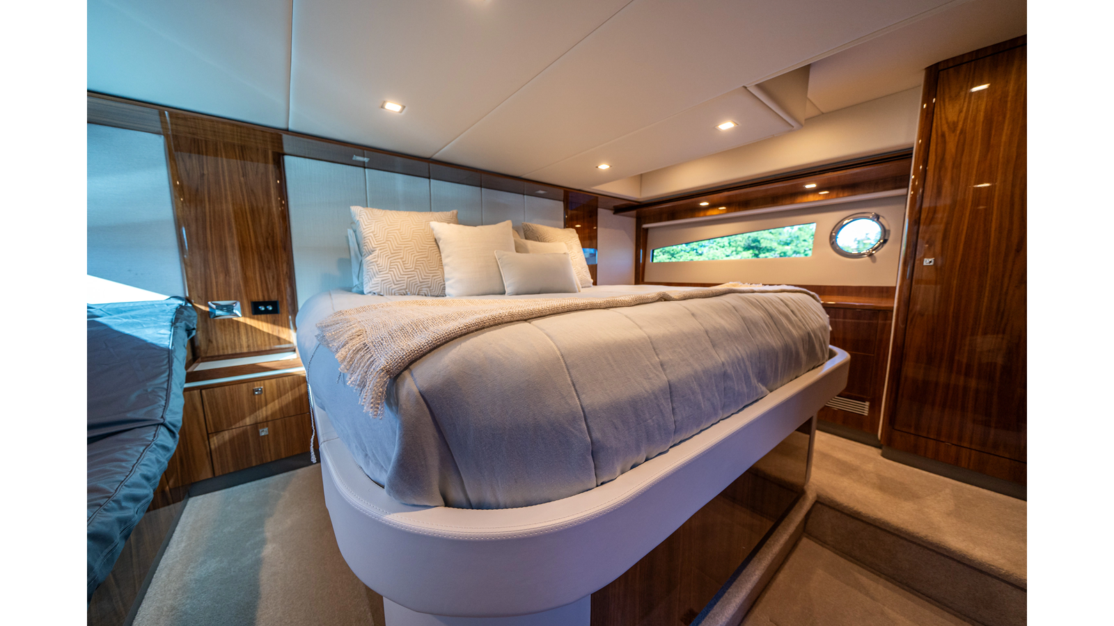 - Three-stateroom layout with high-gloss timber finishes