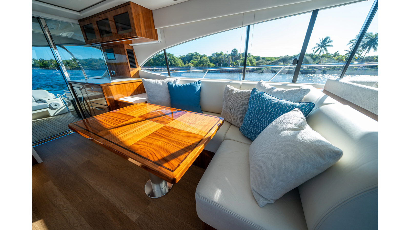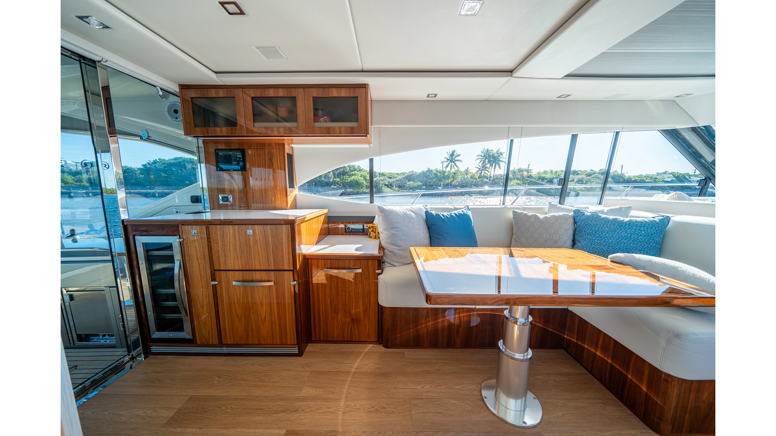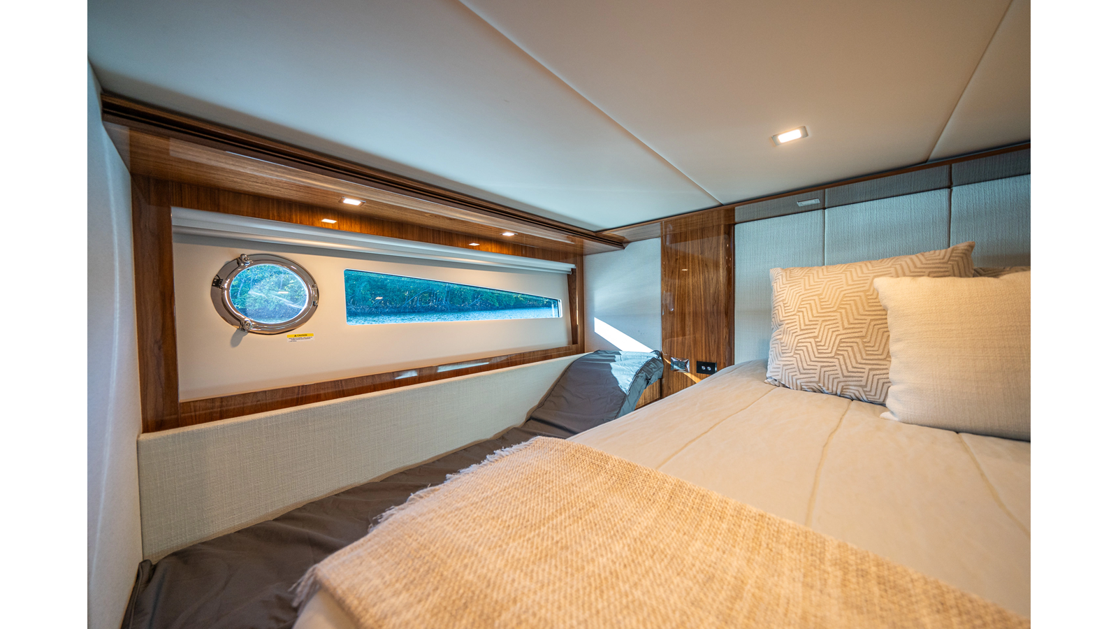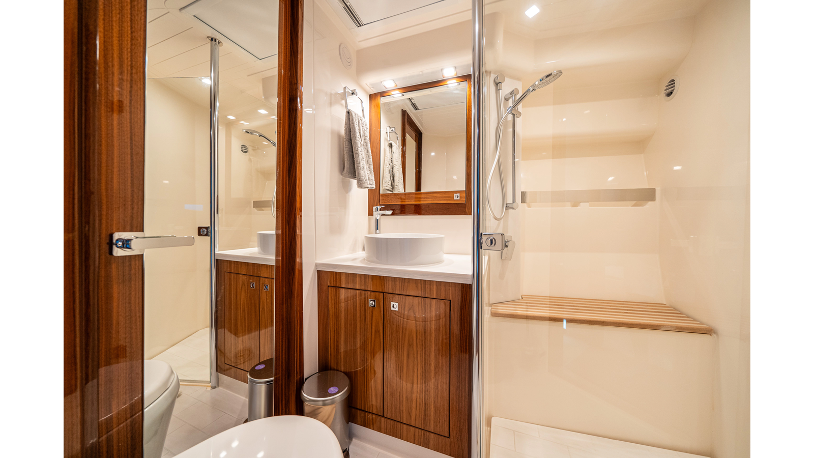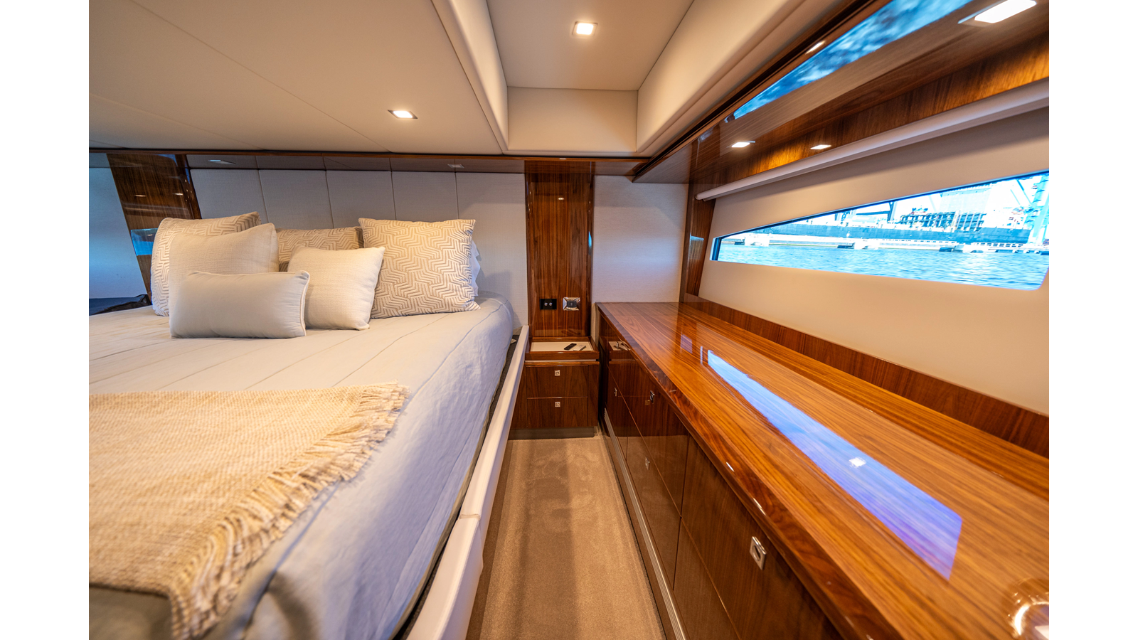- Three-stateroom layout with high-gloss timber finishes
