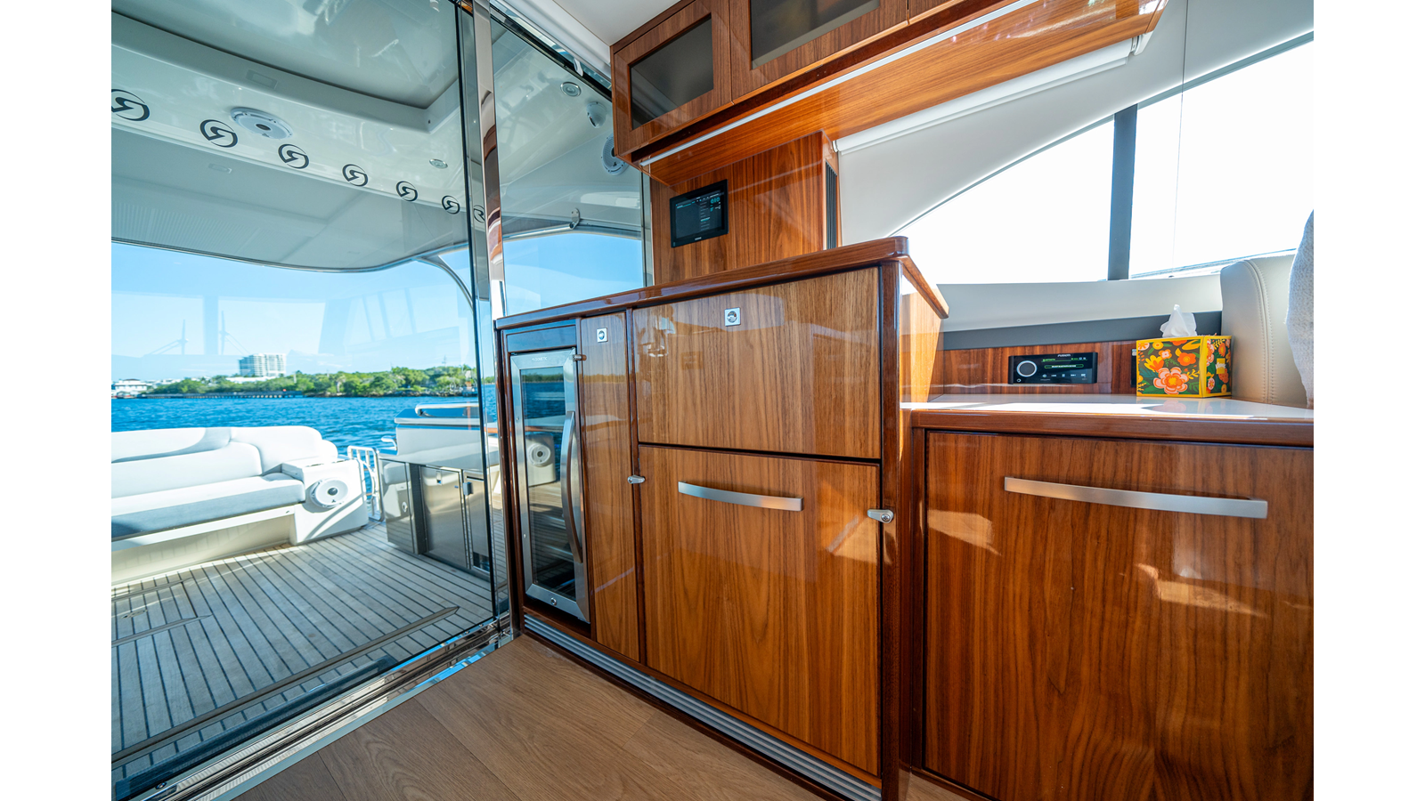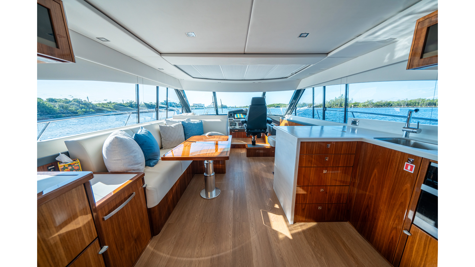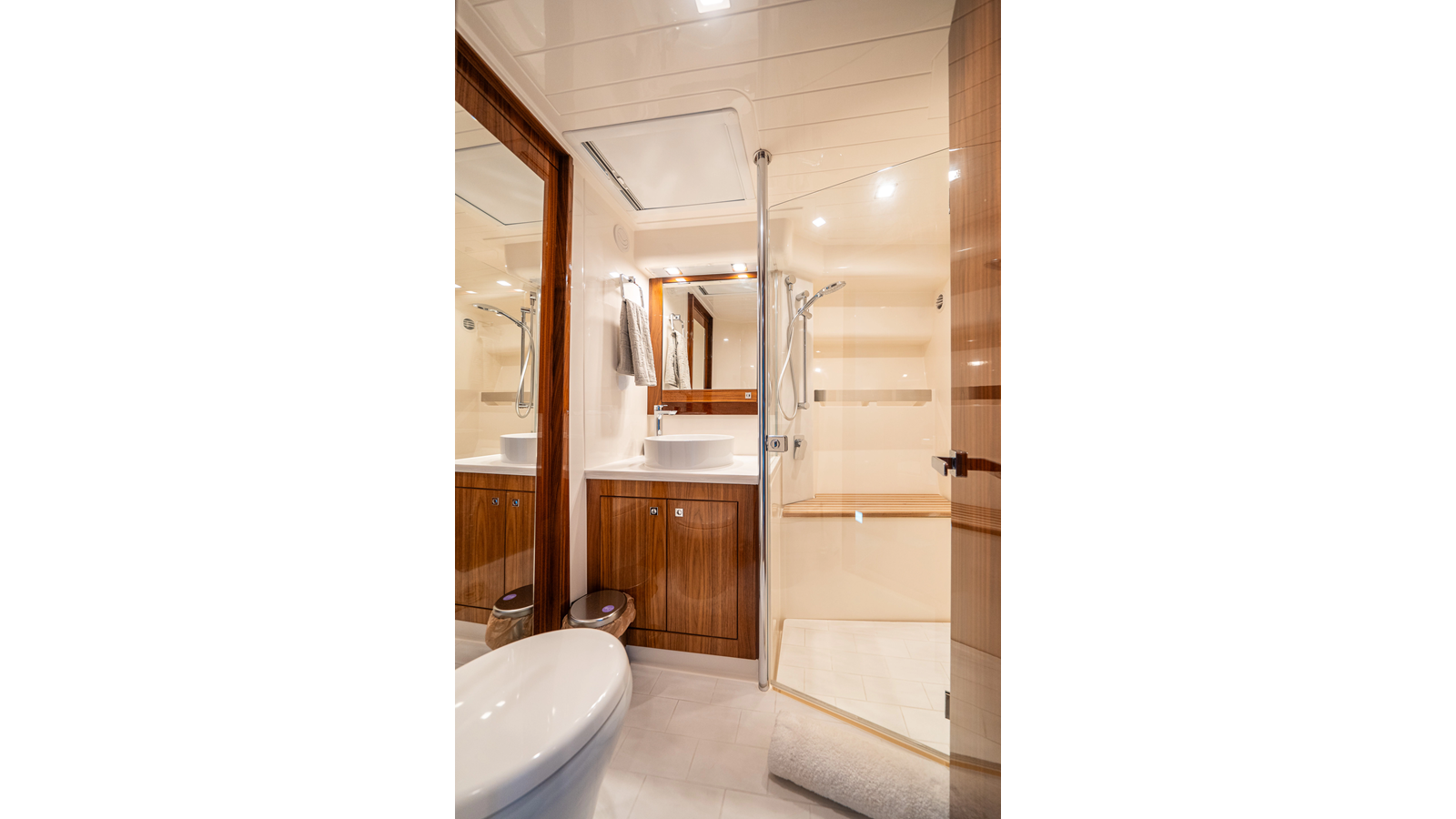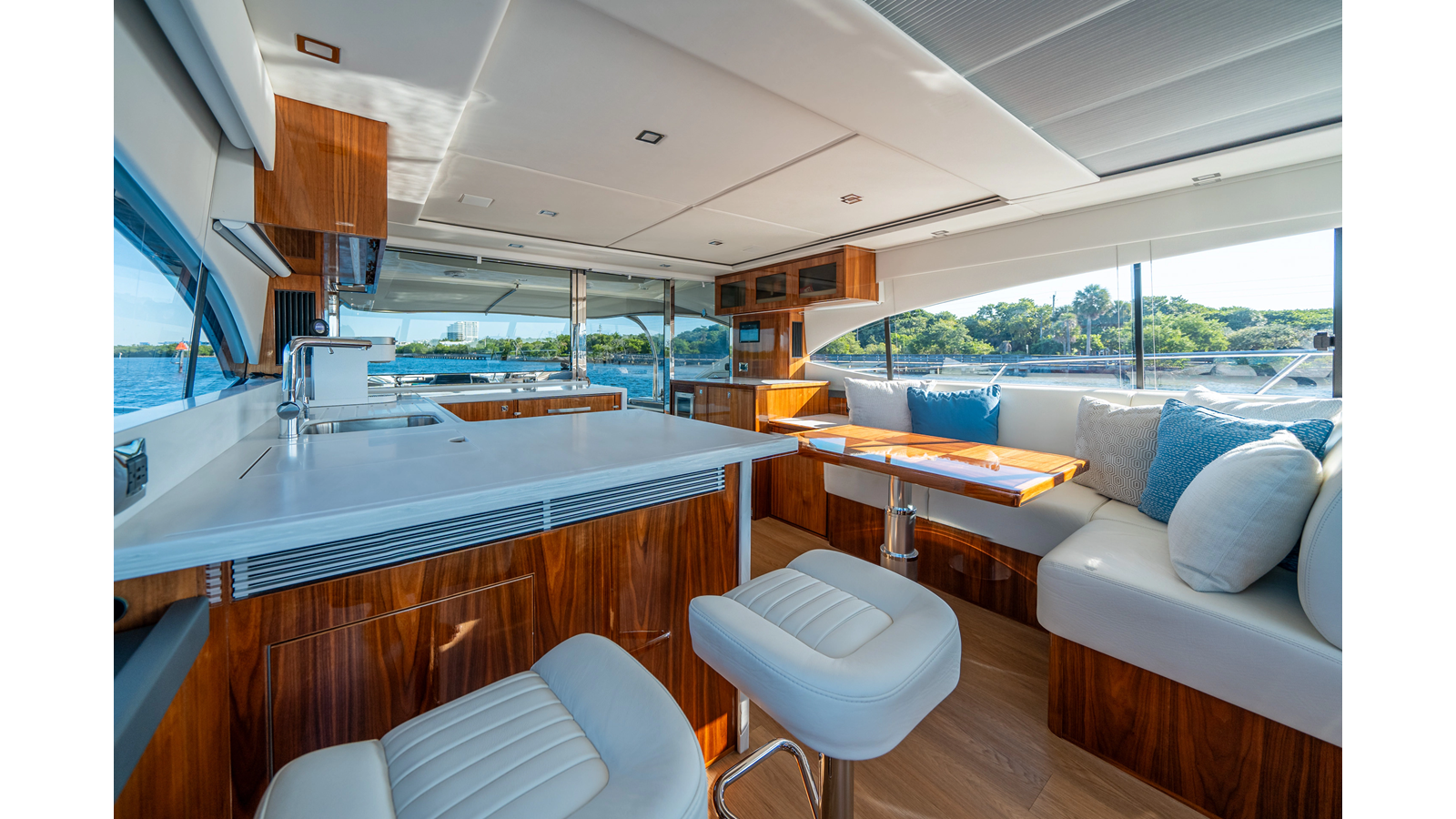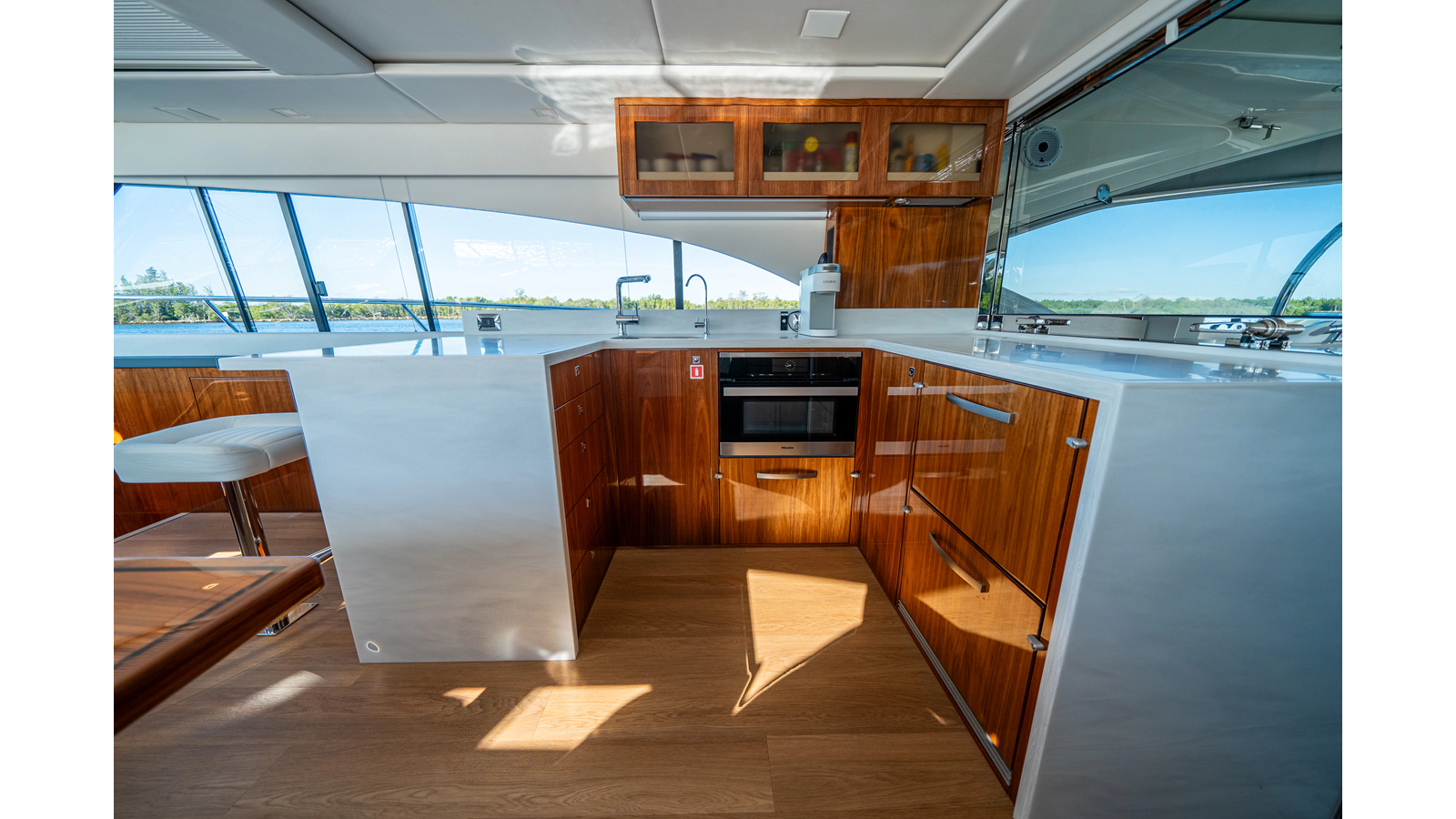 - Three-stateroom layout with high-gloss timber finishes