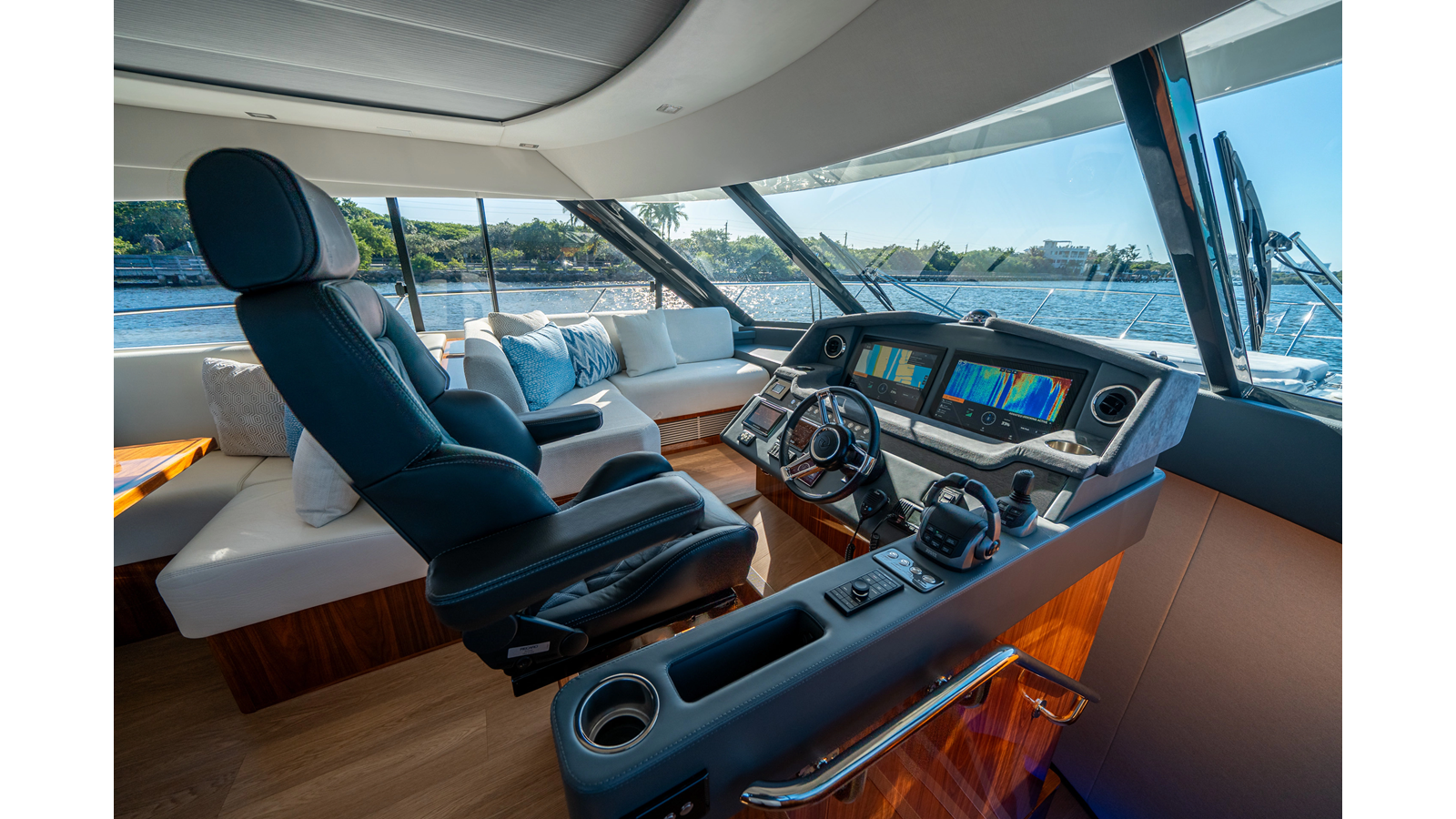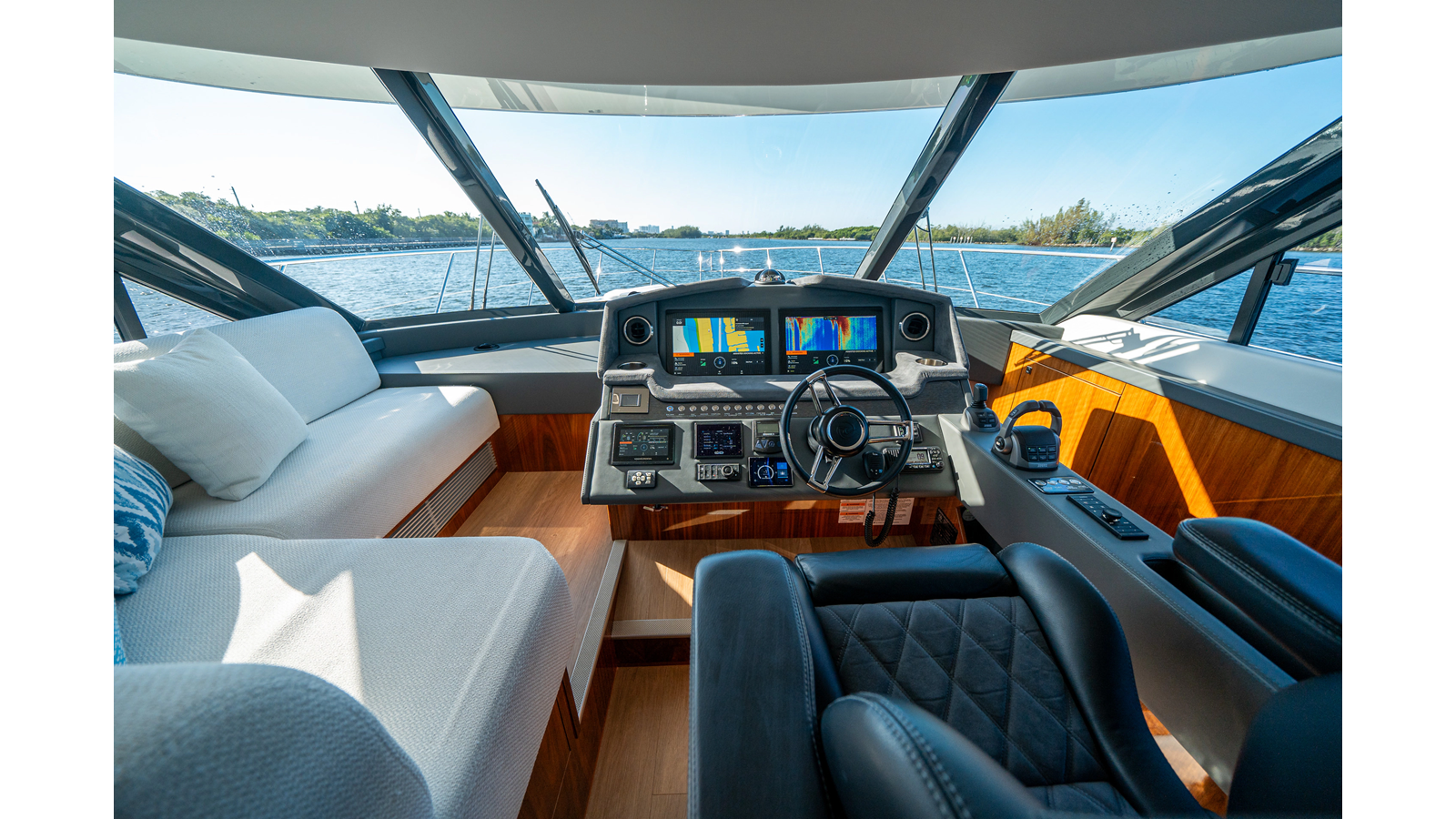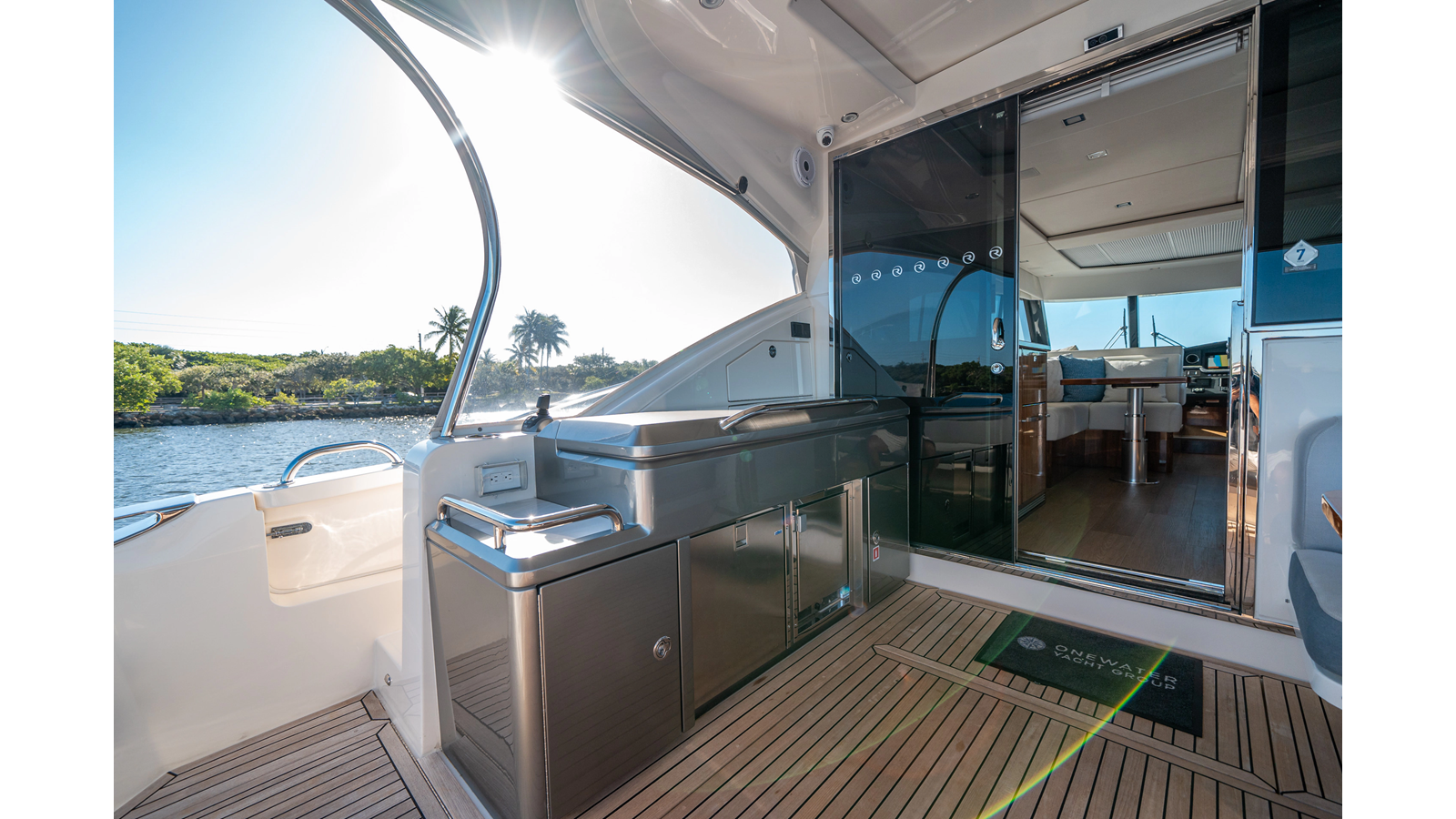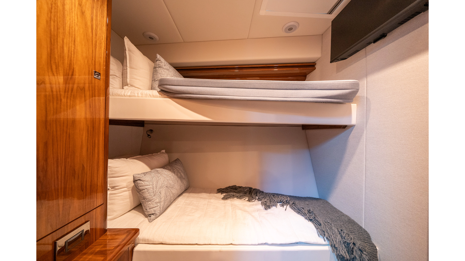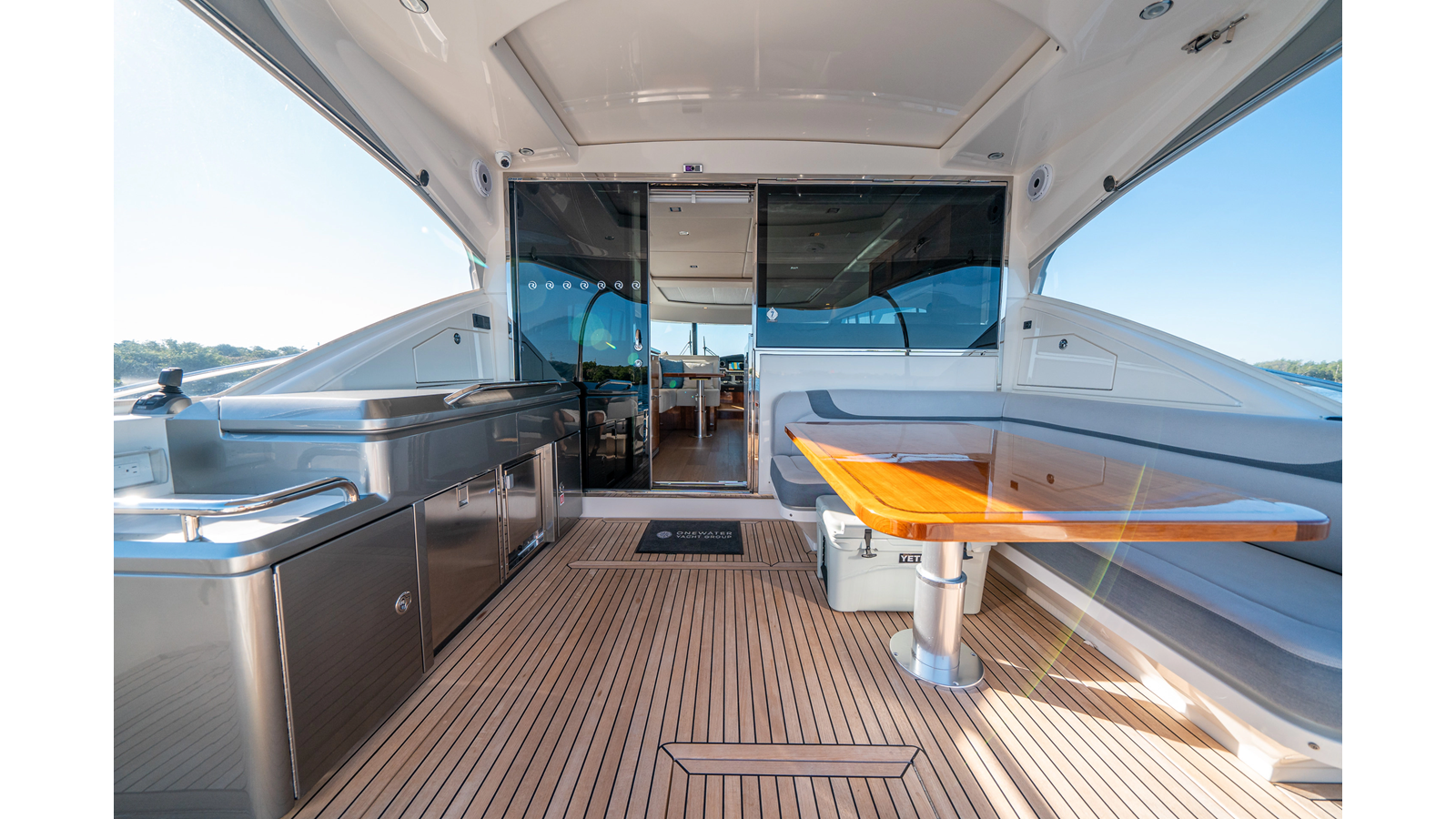 - Three-stateroom layout with high-gloss timber finishes