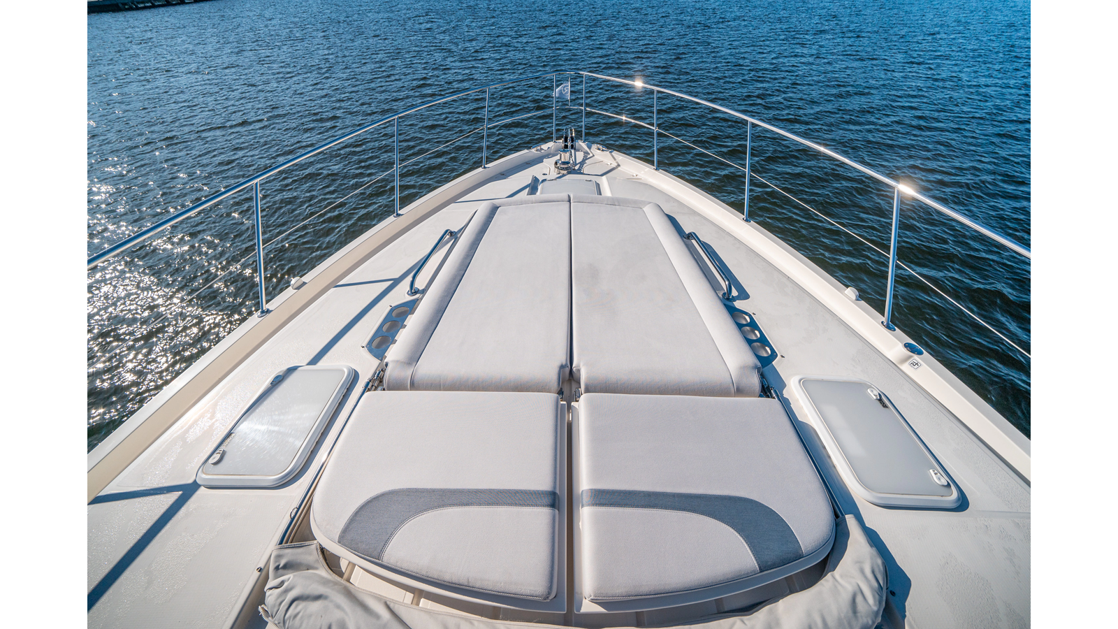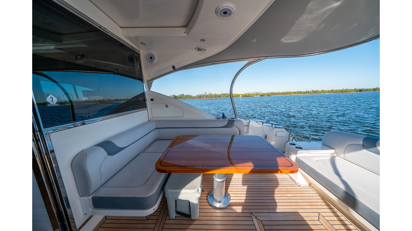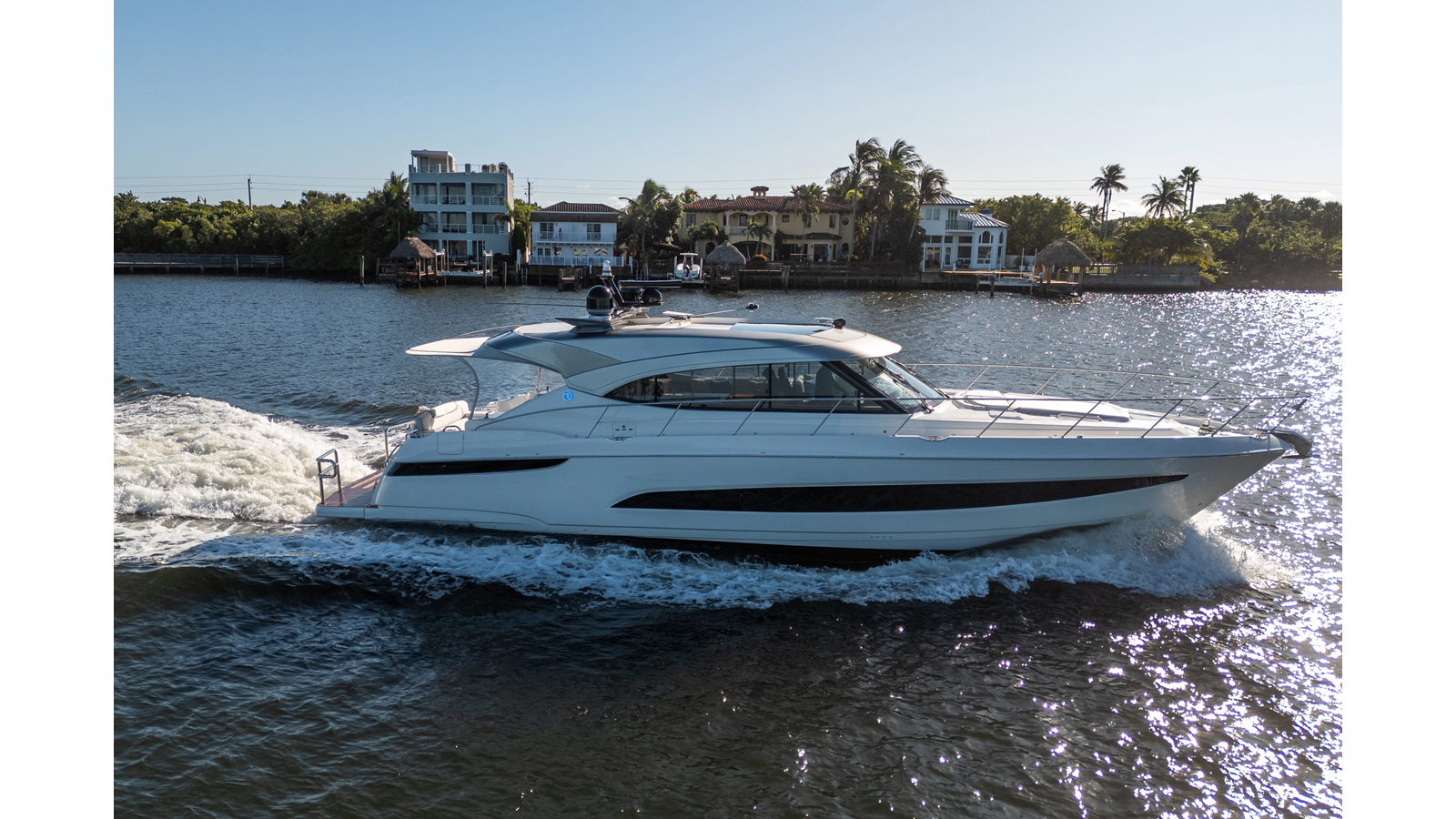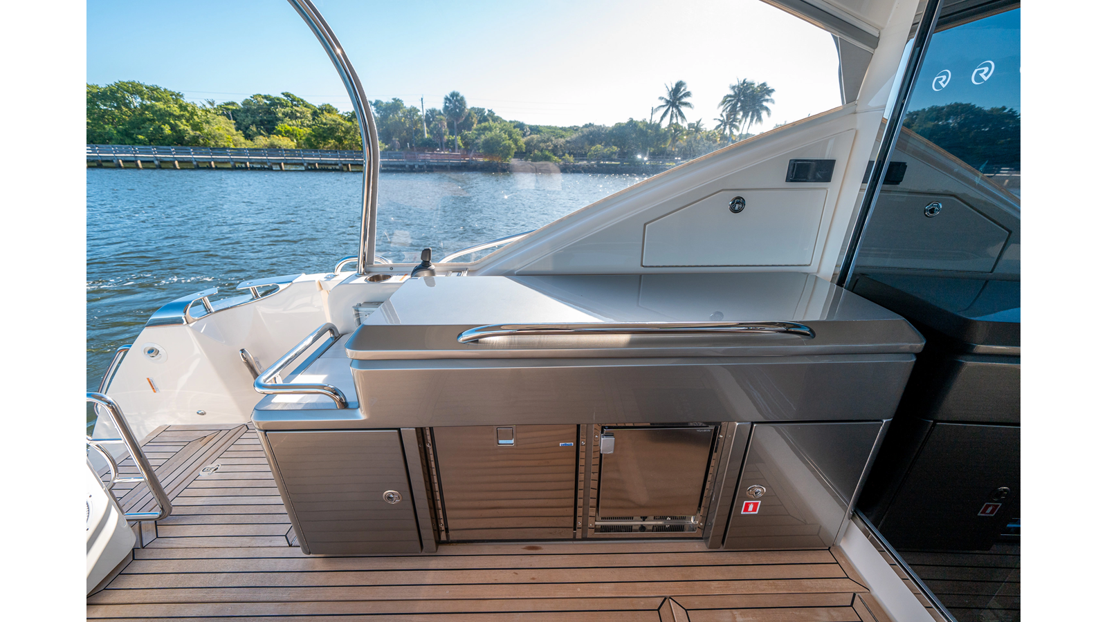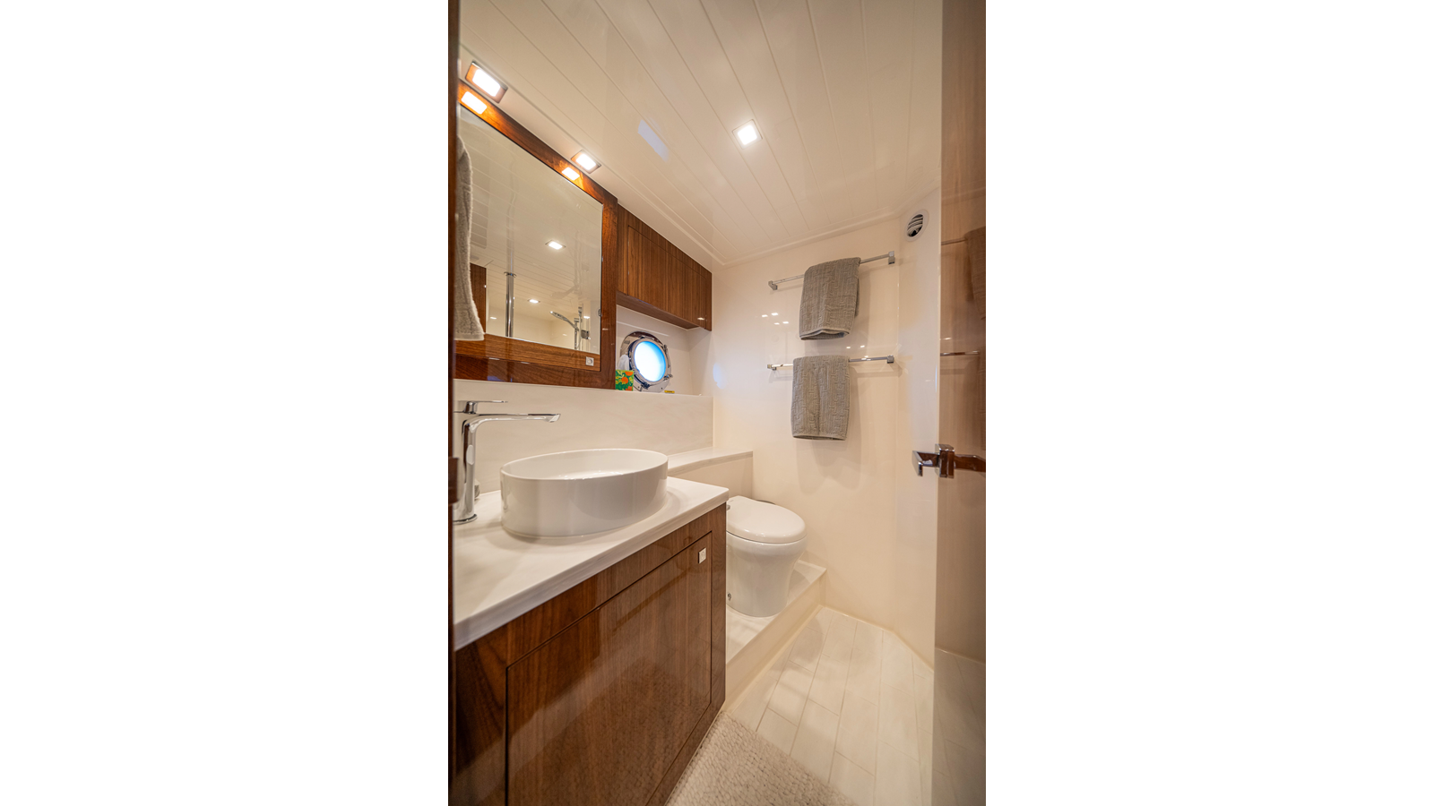 - Three-stateroom layout with high-gloss timber finishes