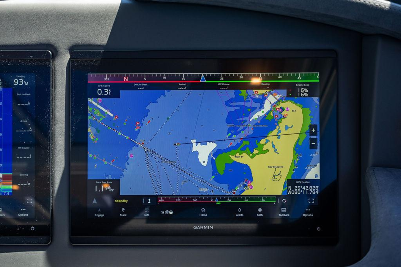 -Dockmate wireless docking remote -Garmin ( 2) 17" Glass Bridge 8617 incl. GPS and GRID Controller with integrated autopilot -Garmin GSD 26 CHIRP sounder with 1kW B275LH depth/temp transducer -Garmin GSD 25 CHIRP Sounder w/Clear Vu /Side Vu 500W and traditional 600W transducer -Garmin Integrated Autopilot -Garmin Radar 4kW GMR fantom CHIRP 54 Open Array -FLIR M232 Thermal Camera -Siren Remote Monitoring -ICOM VHF radio with antenna -Electronic engine control unit, twin lever gear and throttle -Ergonomically designed console with 2 x drink holders storage tray, electronic engine controls and joystick docking control -Helm and companion chairs-high quality leather (black). Master seat has electronic in/out adjustment -Steering wheel-luxury and leather bound -Windscreen-curved, clear tempered glass with two pantograph wipers with intermittent control including washers off fresh water system -Air conditioning outlets at helm and vent outlets at windscreen -Anchor chain counter -Compass, 4.75' with light -Cockpit Speakers: JL Audio Upgraded Speakers and Amps -DVD Player -Stereo's Yamaha and Fusion -Starlink