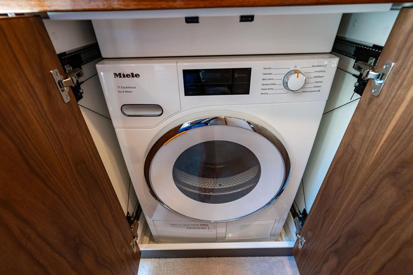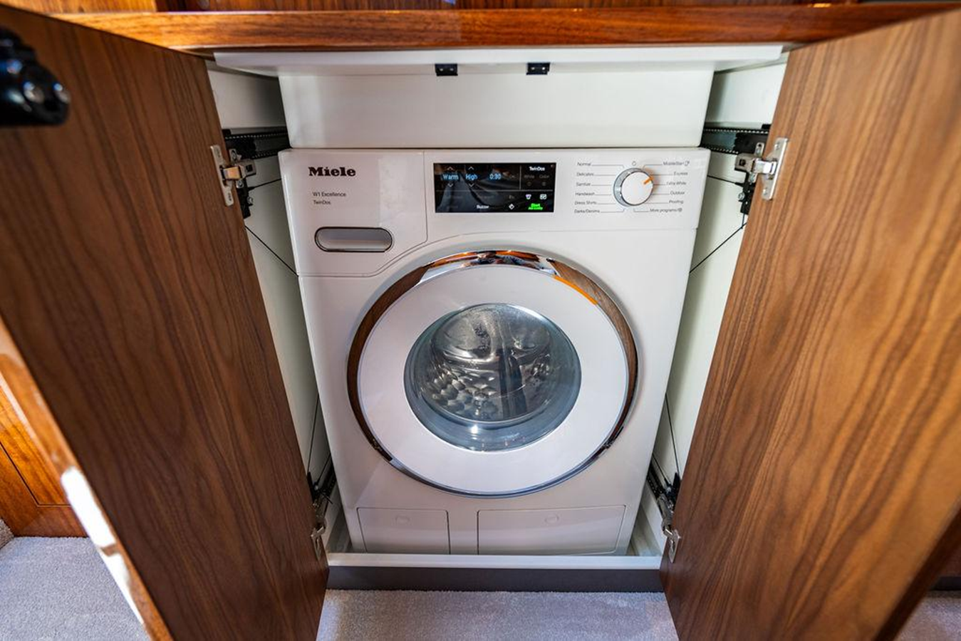 The house power is 24-volt, which allows for simpler charging, lower current draw and smaller cables (further reduced weight) than equivalent 12-volt systems. Mastervolt AC-DC inverters provide power to the icemaker, entertainment systems and all outlets onboard, ensuring watching television while relaxing quietly at anchor is whisper-quiet.
