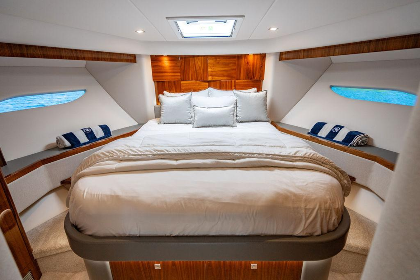 The VIP stateroom is forward with private, ensuite head. The queen bed is centerline with ample drawer space and hanging lockers.