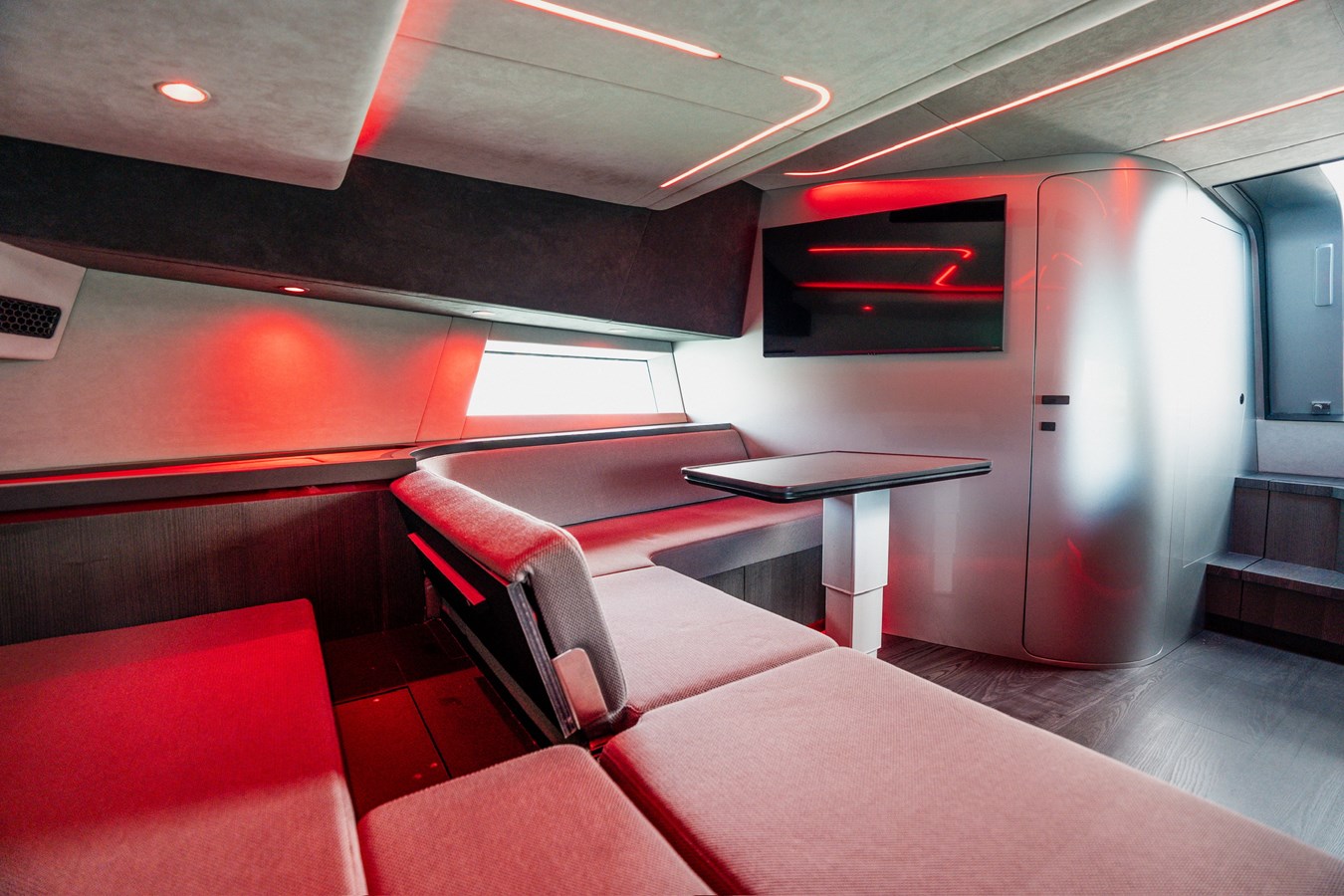 - Dining table with bench seating; helm with 2 custom diamond‑stitched bucket seats