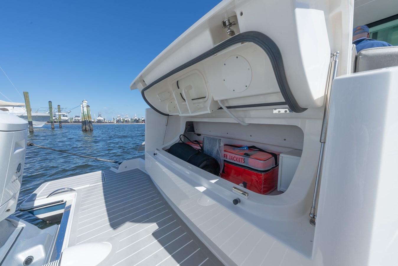 - Aft facing port and starboard lounge seats with drink holders, USB-A/USB-C charging outlets, stereo remote-control pad, and weather covers