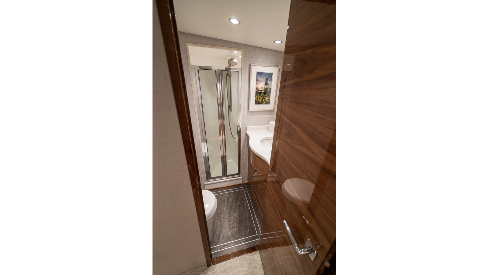 - Maser Stateroom to Stbd Midship: ---Bed, Queen-Size, Walk-Around Fore And Aft Bed, Lift Up Top With Gas Pistons And Maple-Lined Storage Underneath ---Drawer Storage Under Bed, (2) Large Drawers ---End Tables On Either Side Of Bed With Drawers and Storage ---Hanging Locker ---Lighting, Overhead LED Lights And Decorative Indirect Rope Lighting ---Reading Lights, Overhead With Separate Switches ---Stereo 12v w/ Speaker Recessed in Headliner ---TV ---Head with Shower, Sink, Mirror, and Storage