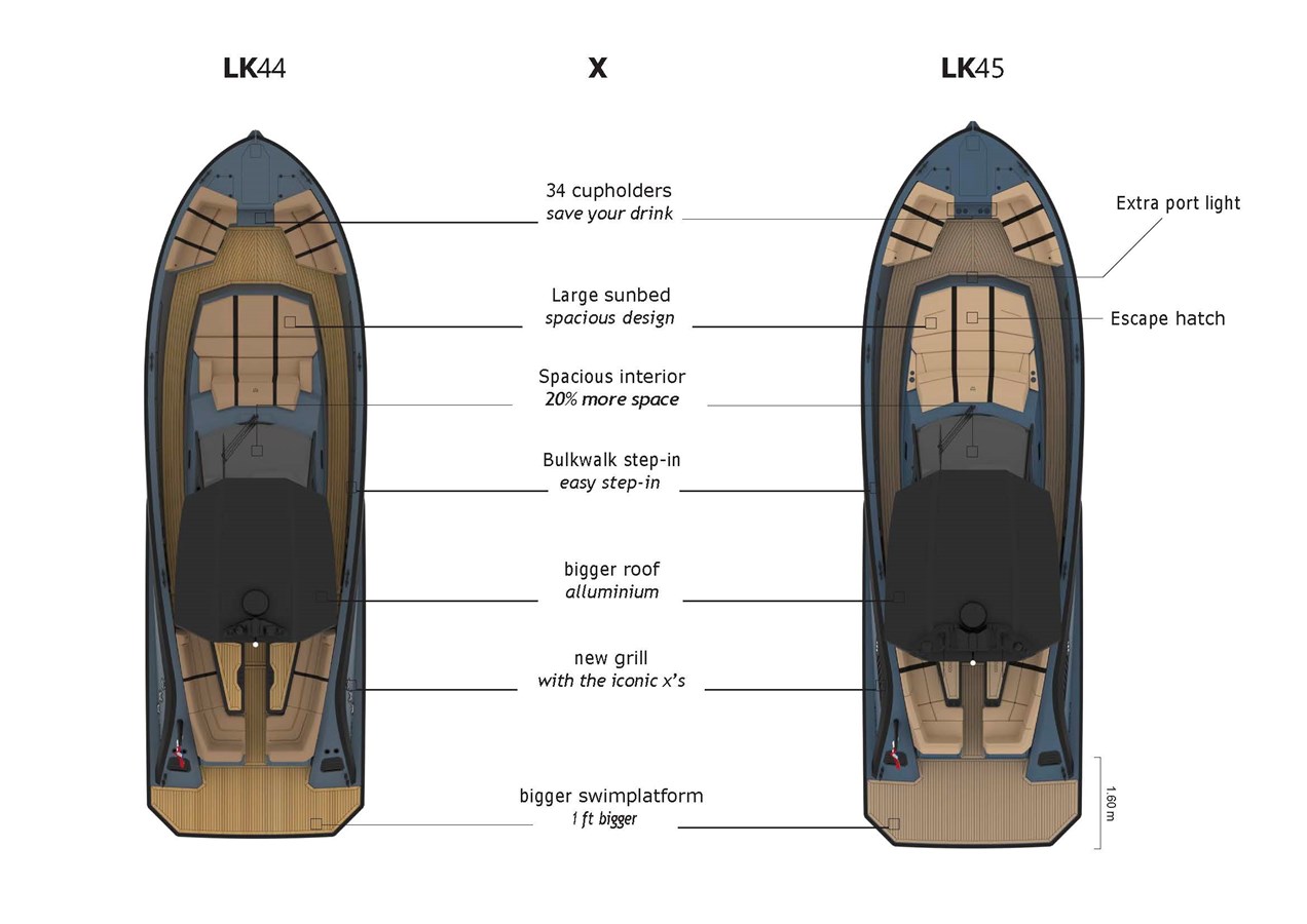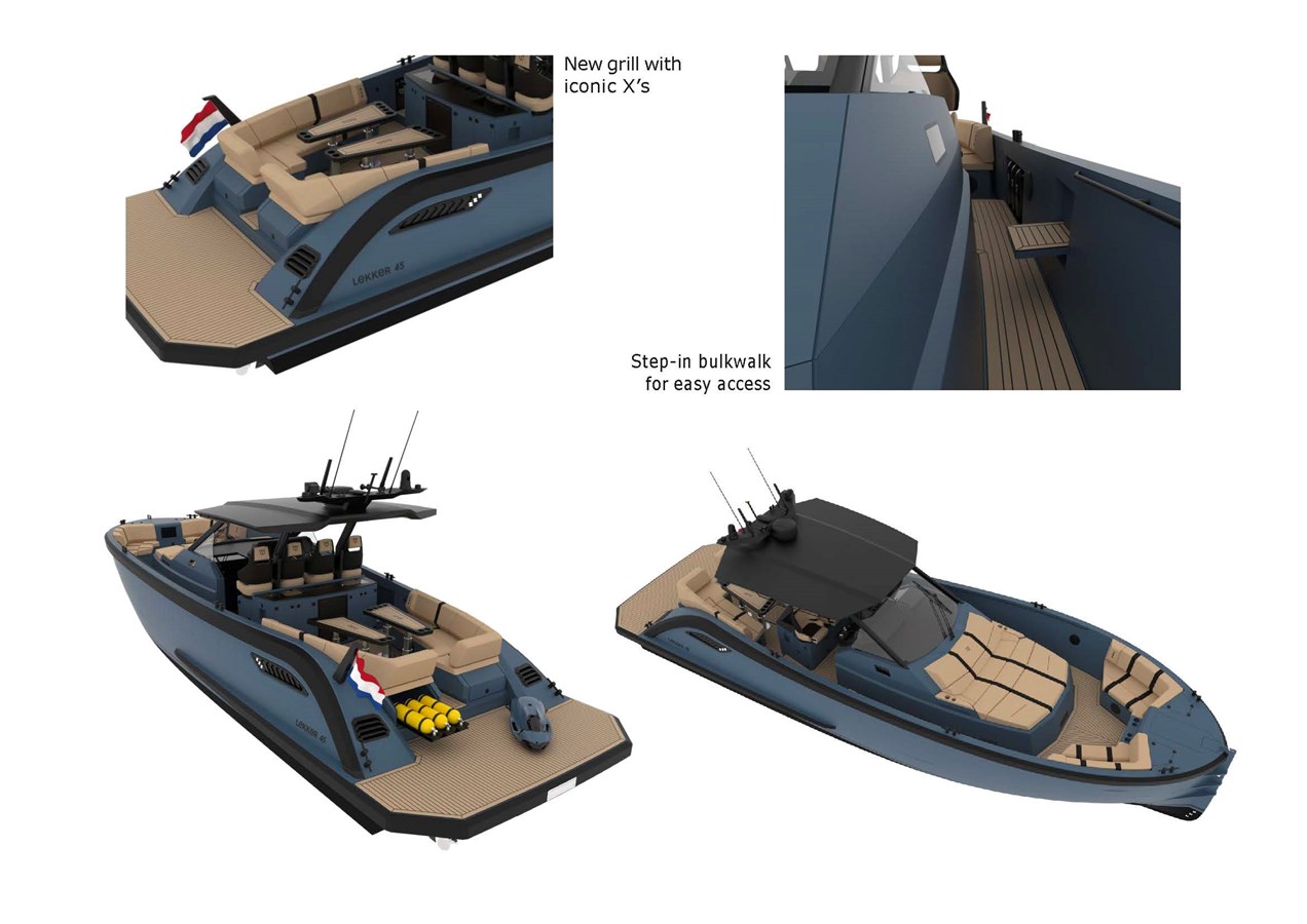 The LEKKER 45 represents a significant leap forward from the celebrated 44, offering 20% more interior space, 34 strategically placed cupholders, a larger swim platform (extended by a full foot to 1.6m), and thoughtful design improvements like the new iconic X-grille, step-in bulkwalk for easy access, and an enlarged aluminum hardtop.
